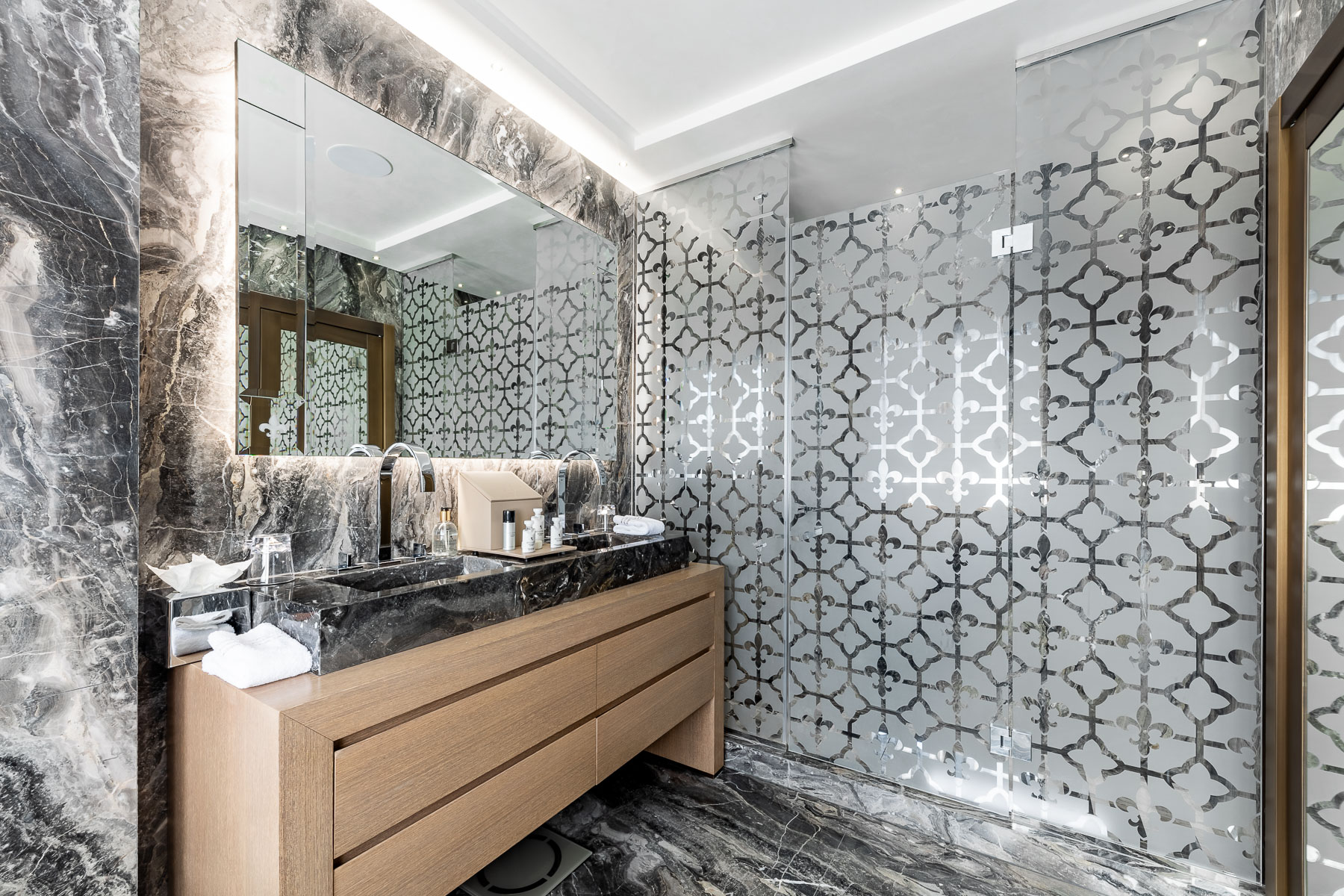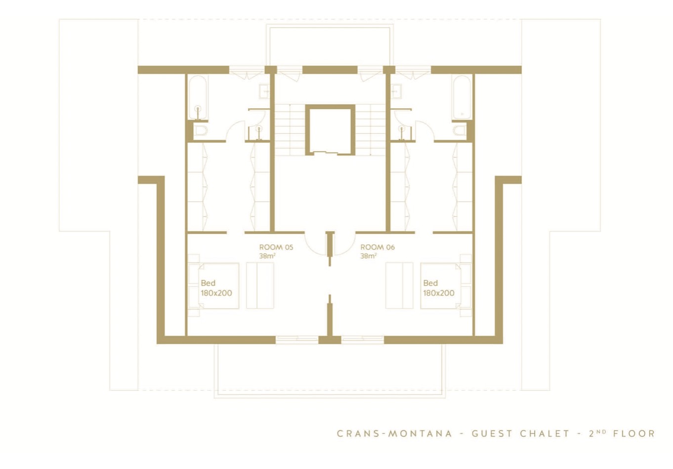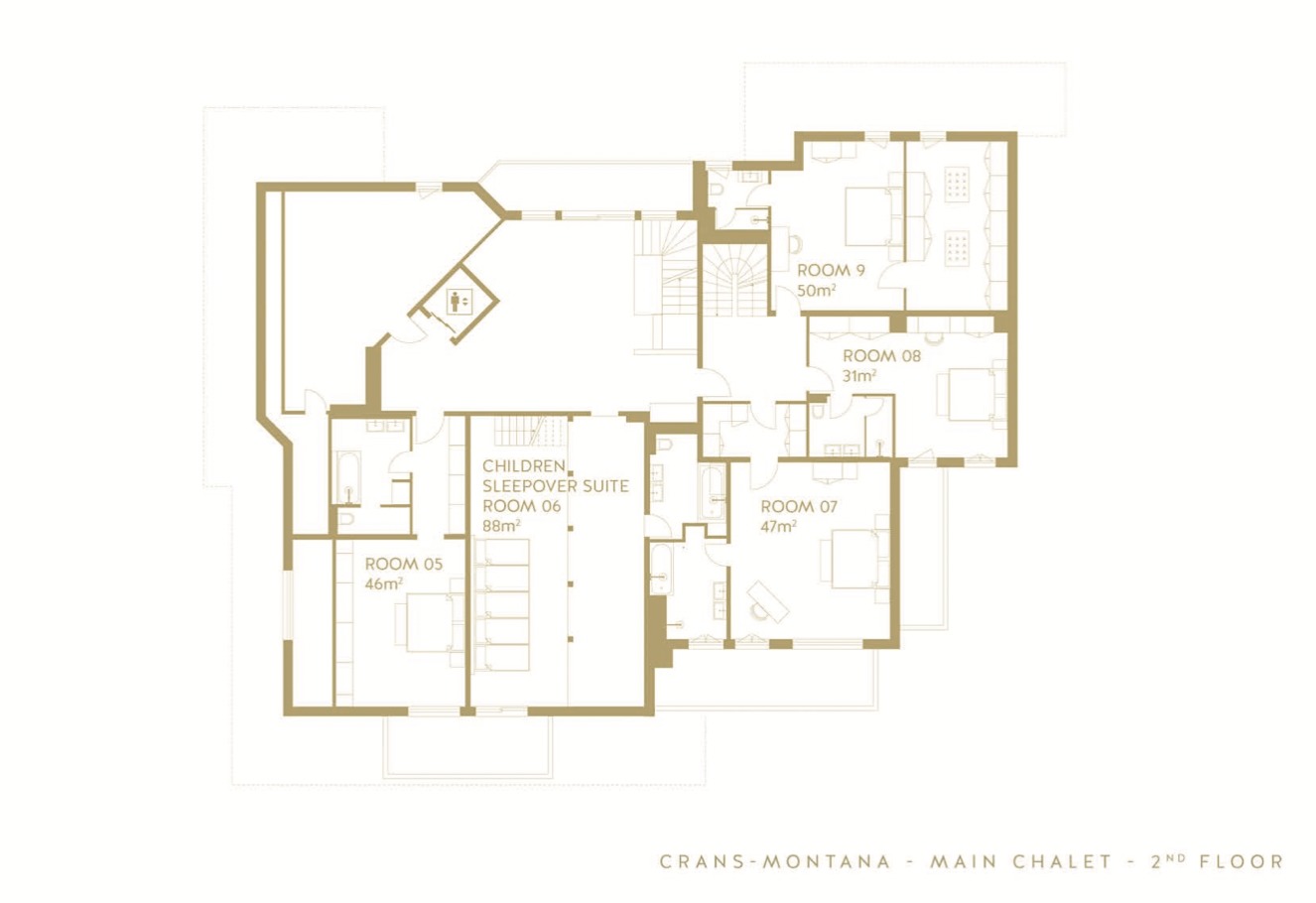 Covering a total area of 820m2, the guest chalet comprises 6 master bedrooms with dressing rooms, ensuite bathrooms and private balconies.