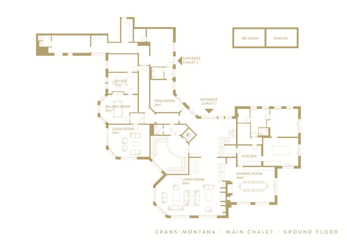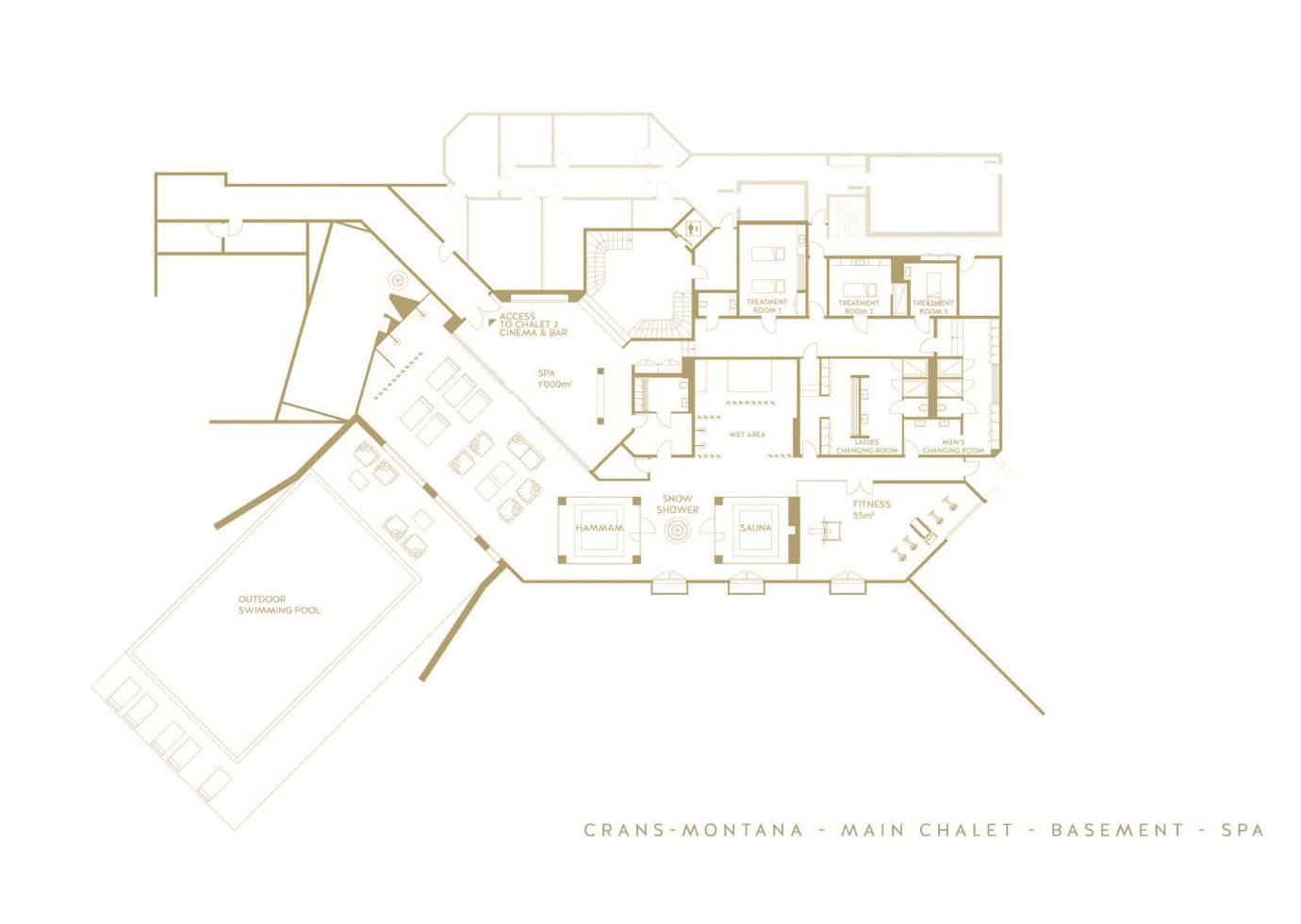 The main chalet consists of ten bedrooms, including two children’s sleepover suites which hosts up to five children each. At the peak of luxury, both chalets provide direct access to the Spa and an entirely equipped gym.