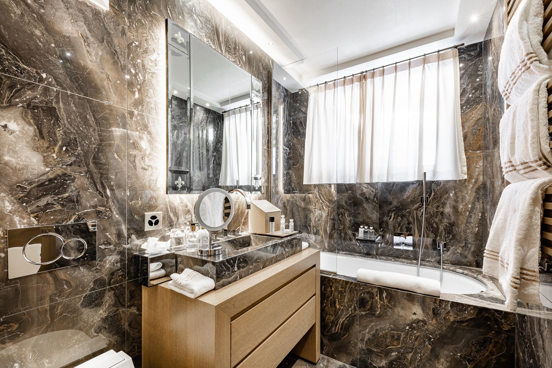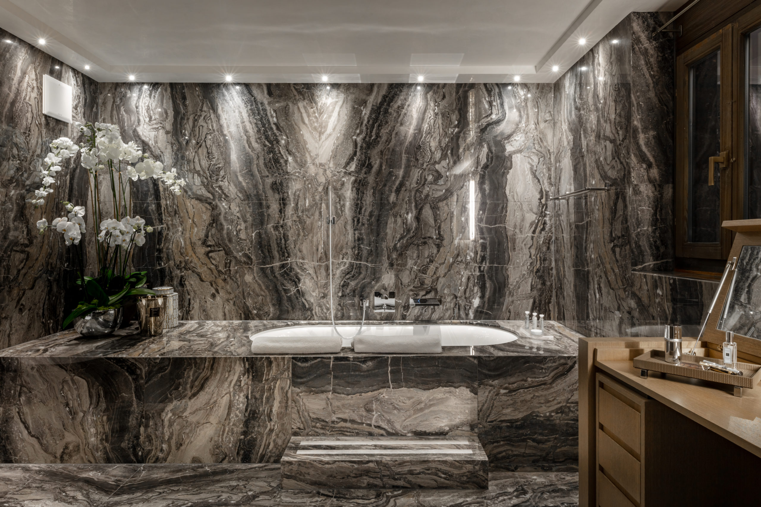 The signature elements have been integrated into the property’s design to bring our guests the feeling of being at home. Its majestic bronze- covered chimneys, leather-padded beds and marble-covered bathrooms are adorned with the cosiest textiles for a luxurious stay in complete comfort.