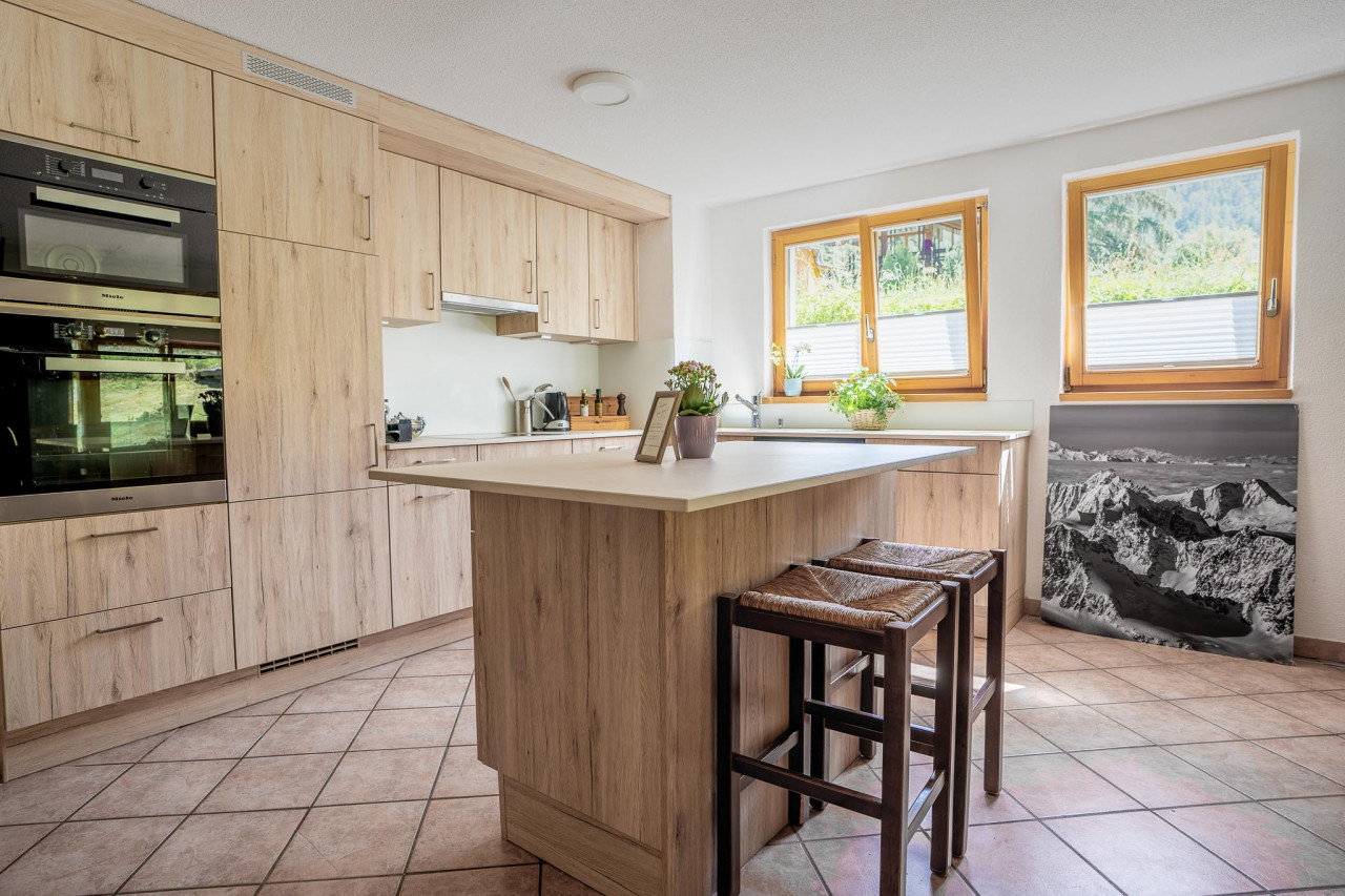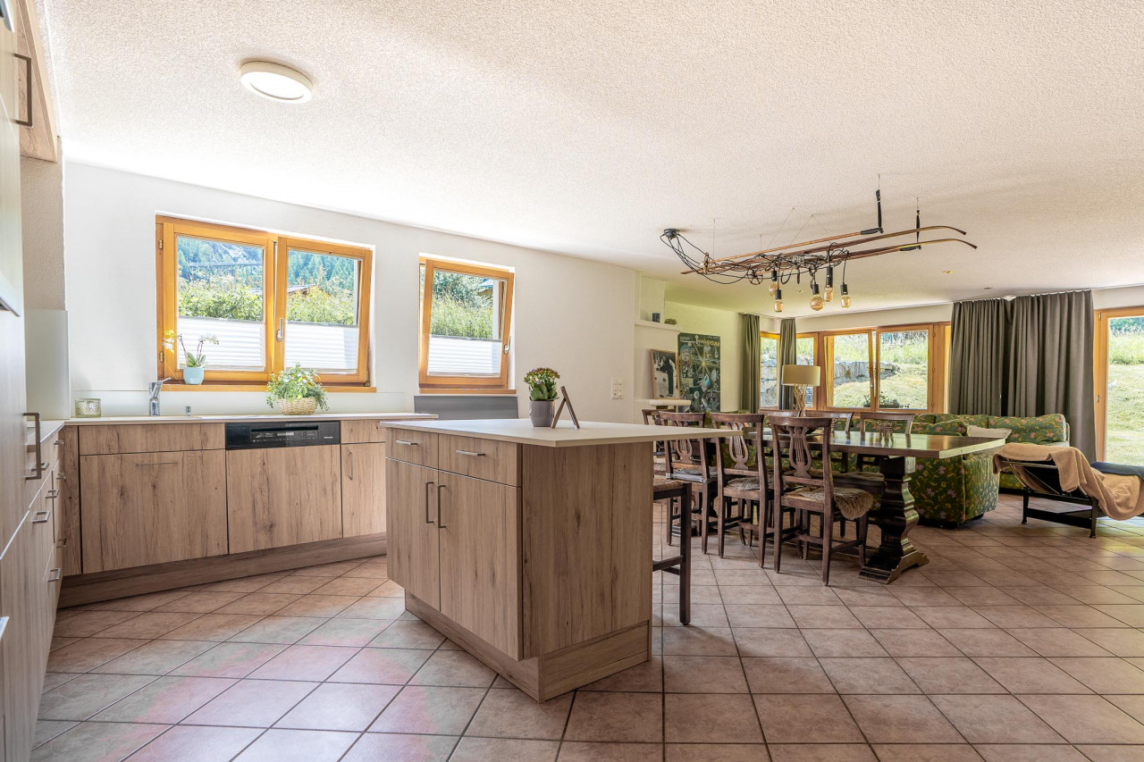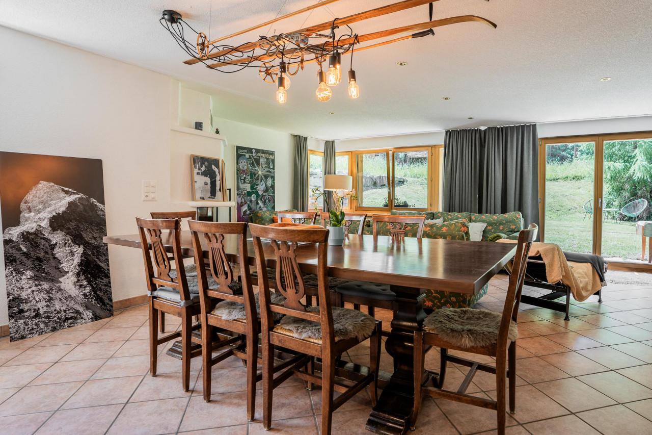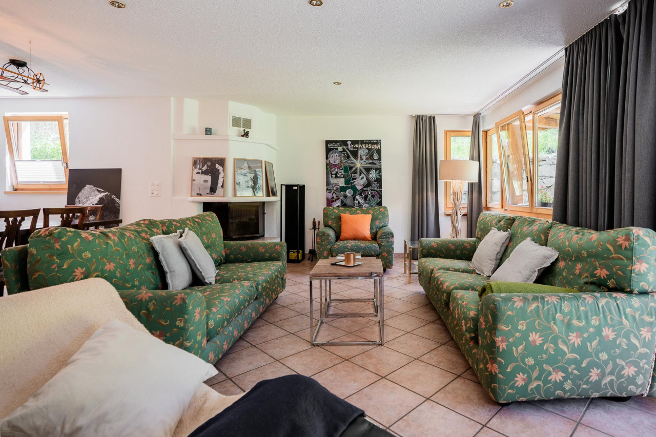 When you enter the Galileo Zermatt Duplex Apartment, you will find a spacious and inviting living area. The open-plan design includes a large living room with plush seating and a dining area. The large windows allow natural light to fill the space and offer stunning views of the mountains.