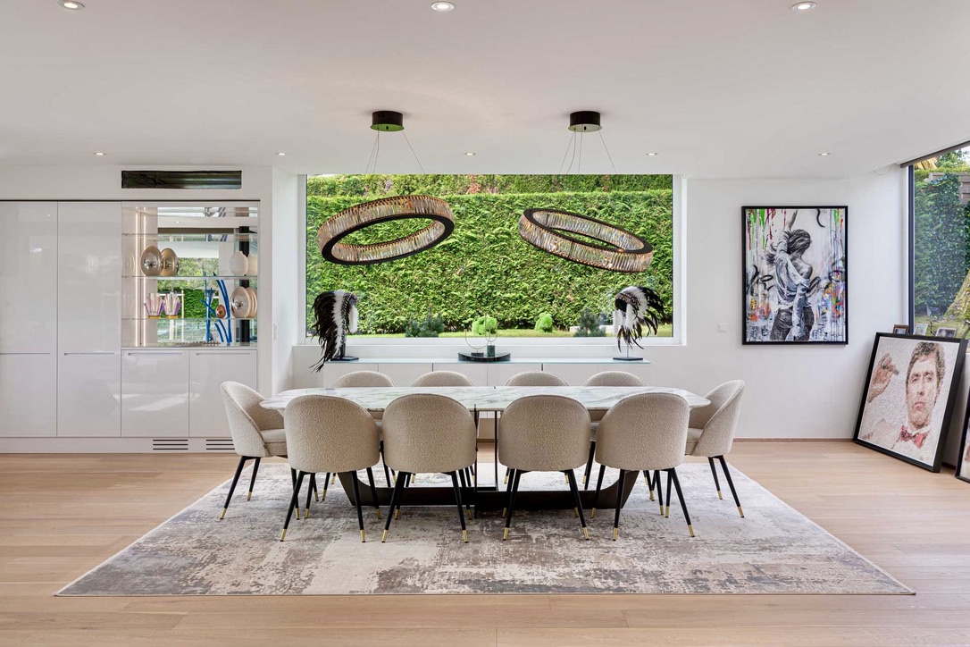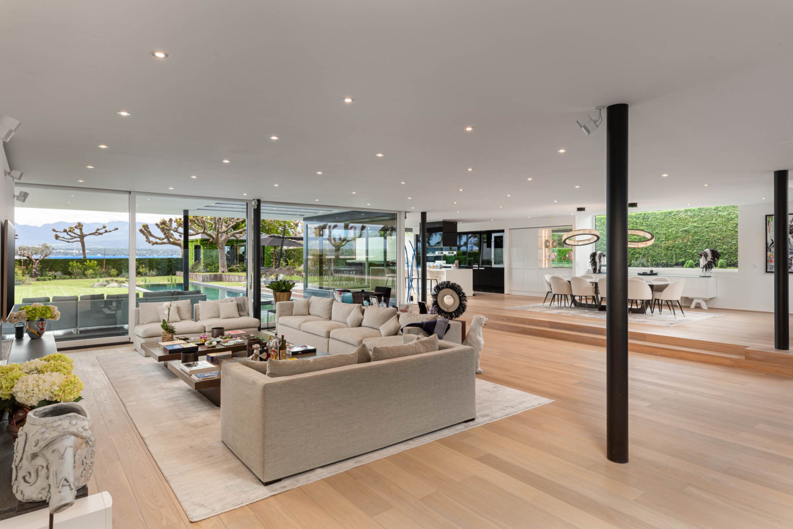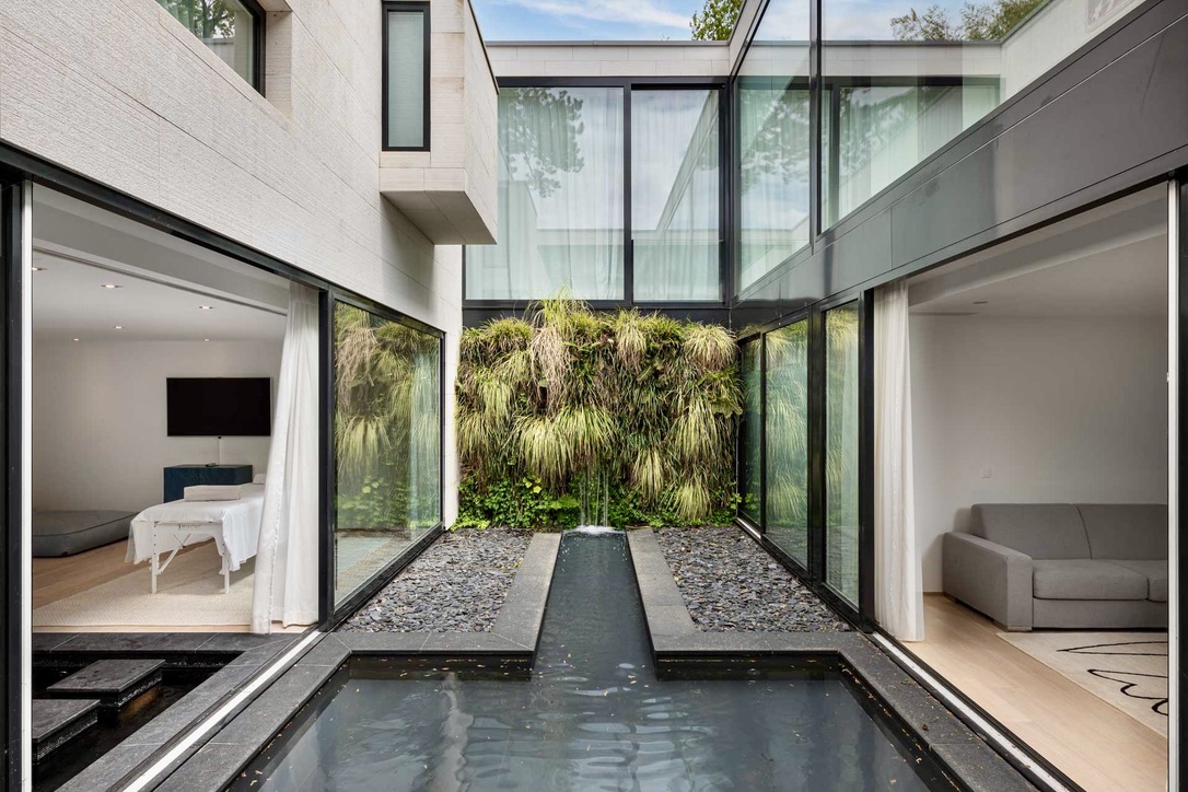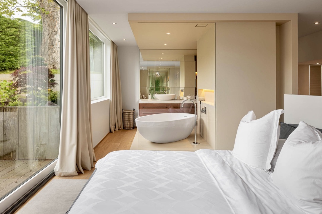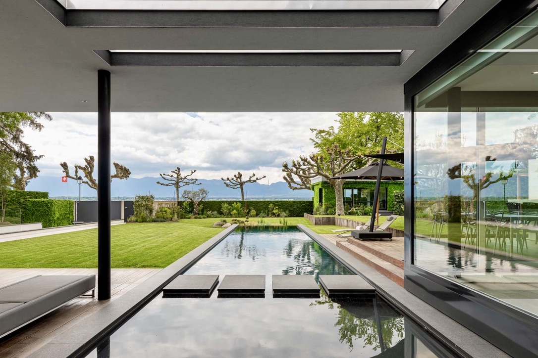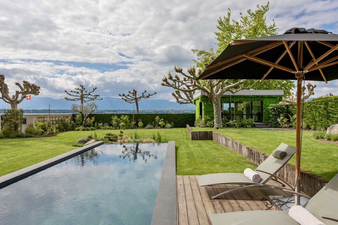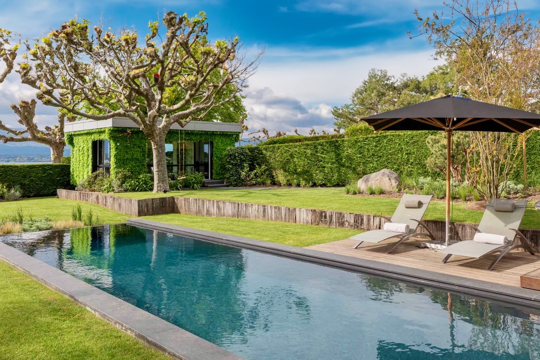 Wake up in one of the five spacious bedrooms. Each bedroom features contemporary design, an ensuite bathroom, and a dressing room. Furthermore, start your day with a refreshing dip in the heated outdoor pool. The pool area, surrounded by lush greenery and the calming sounds of nature, enhances the Geneva lakeside rental experience. Thus, Villa 8Lake stands out with its exclusive amenities.