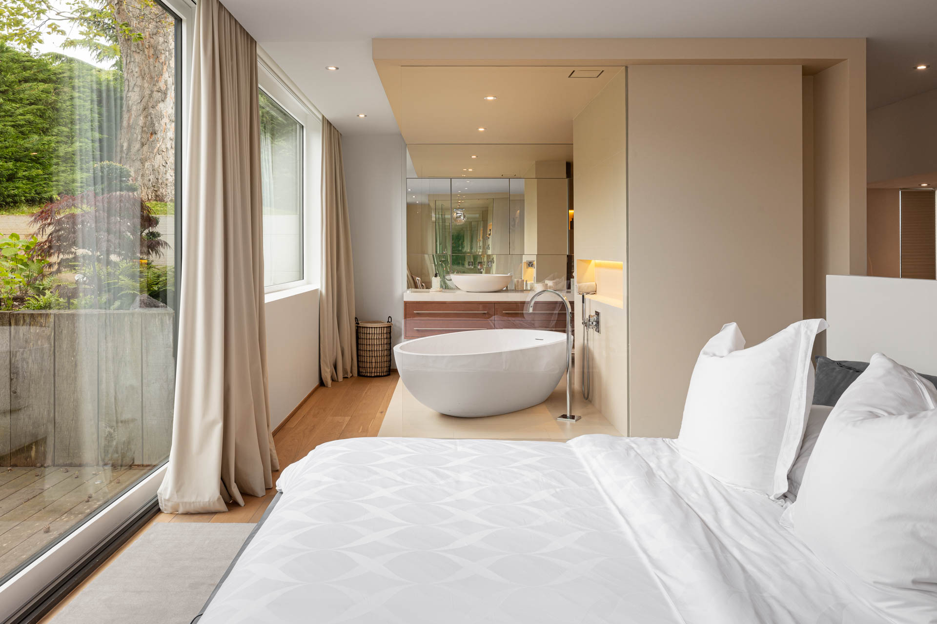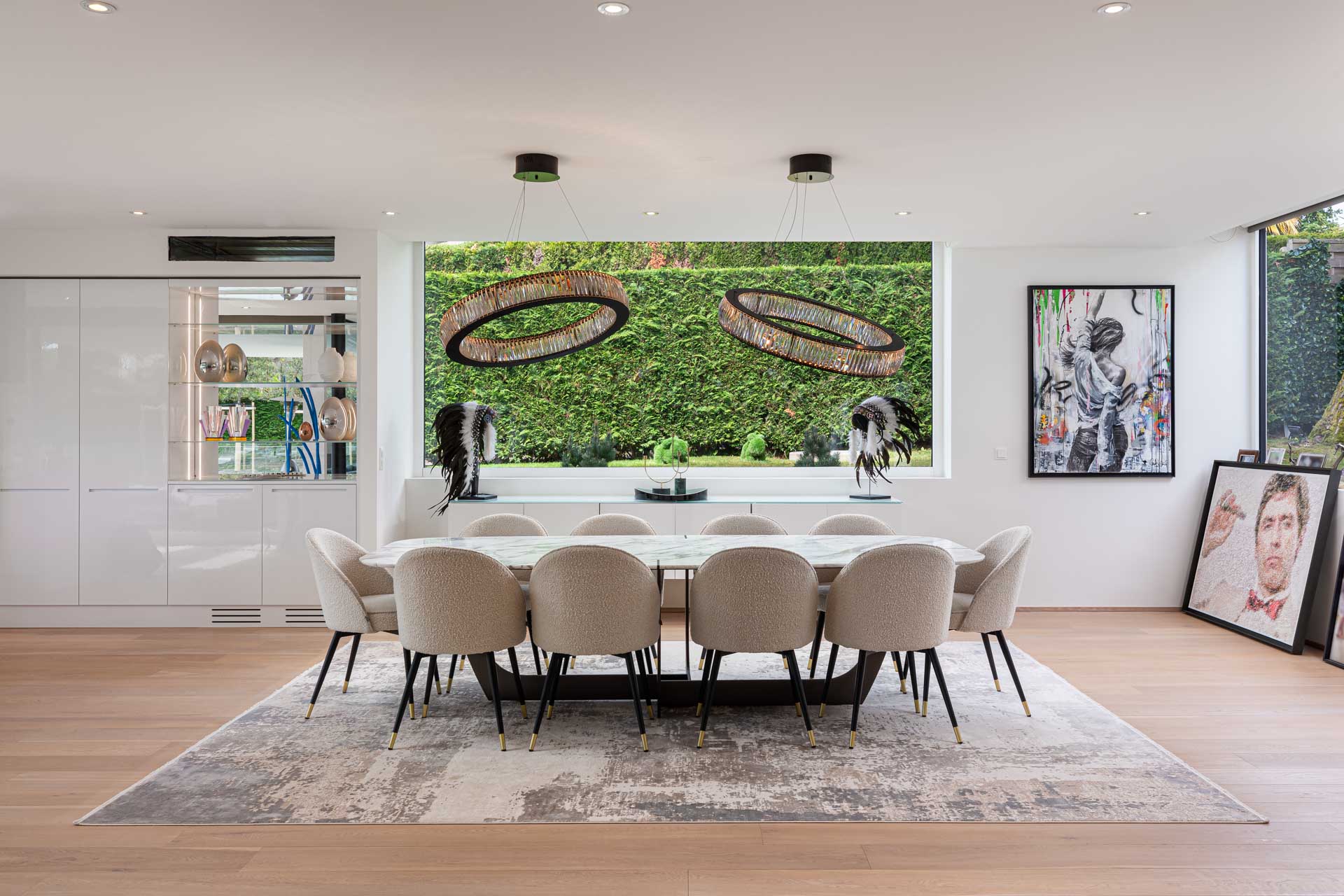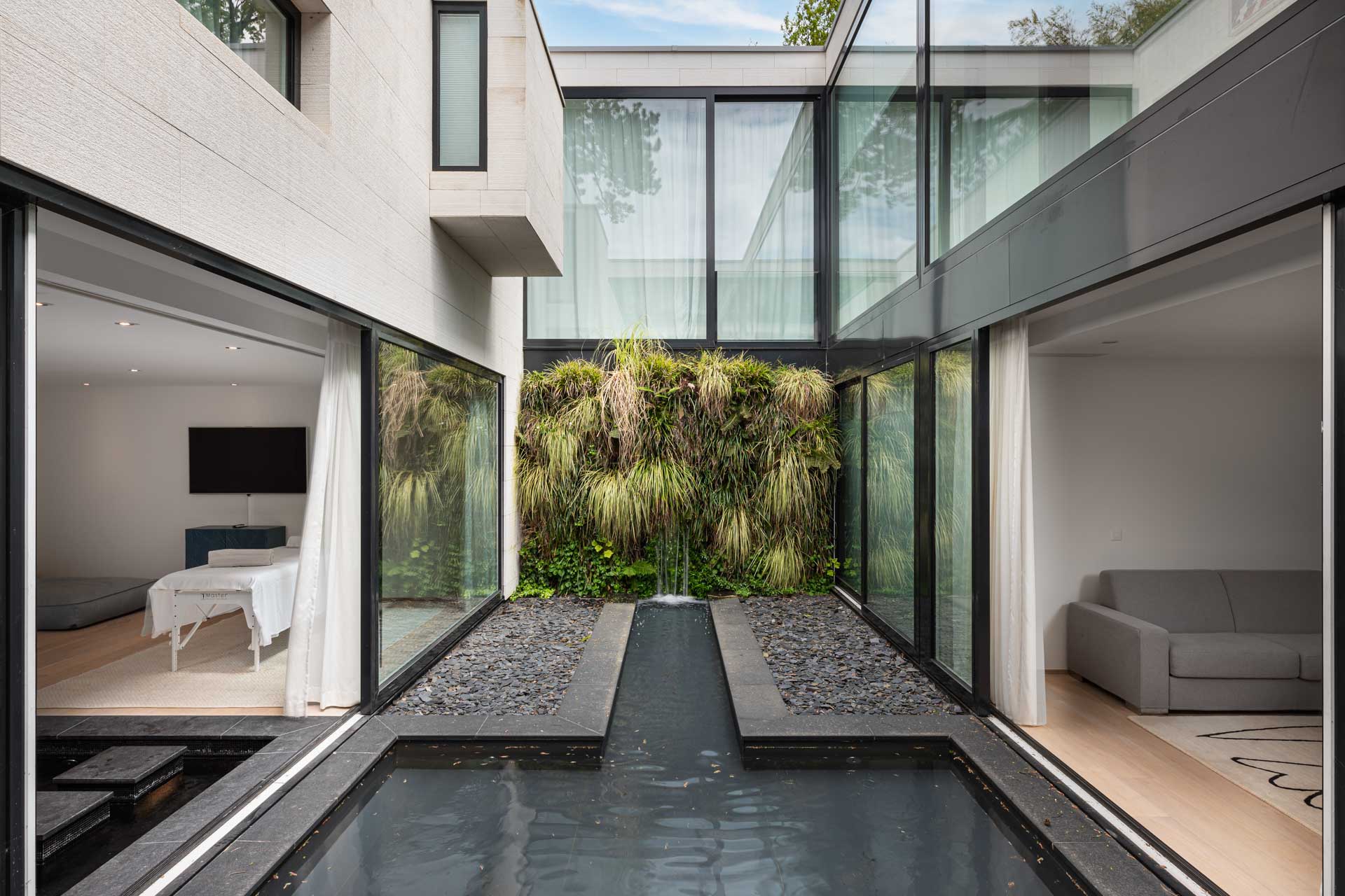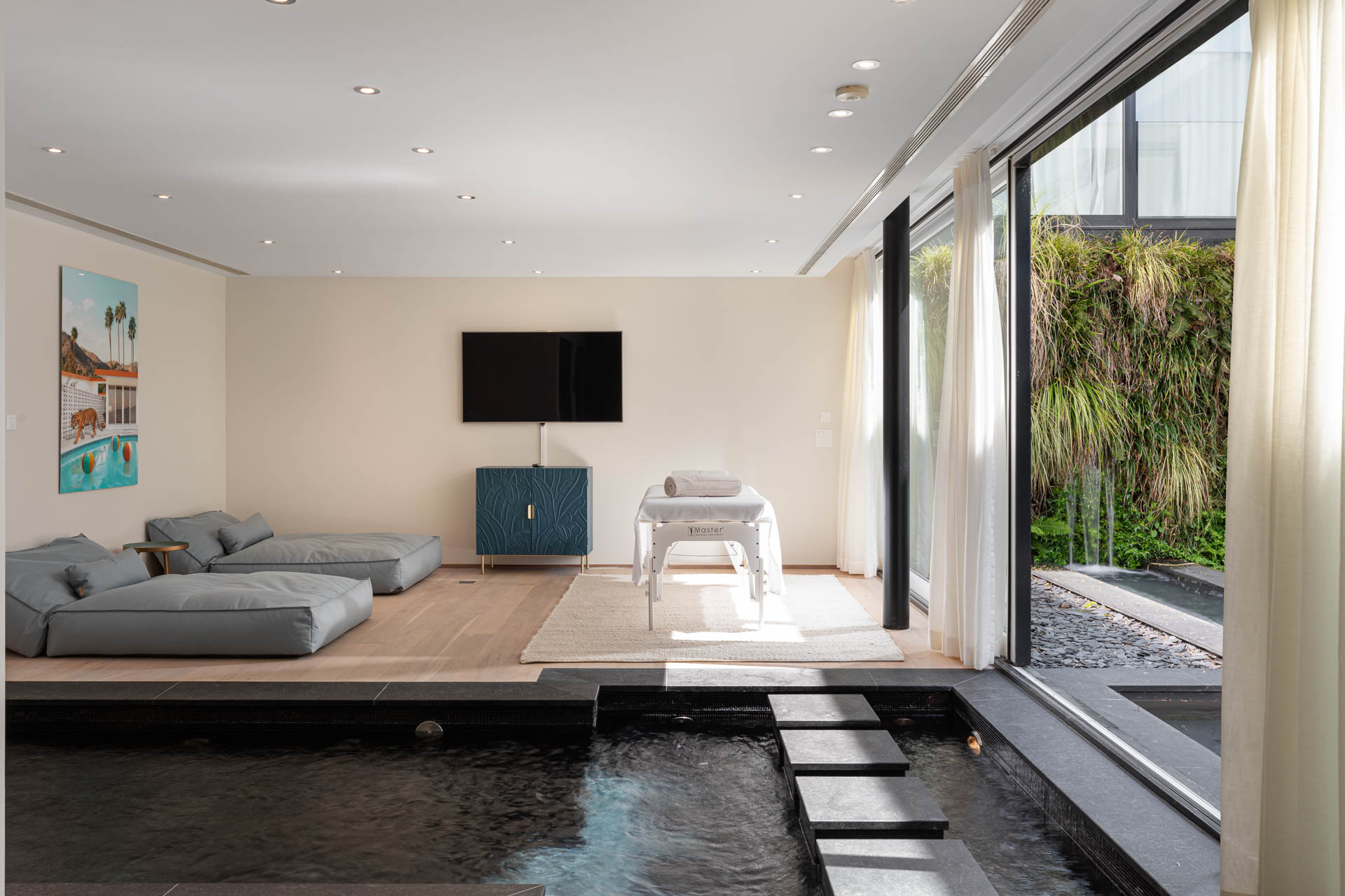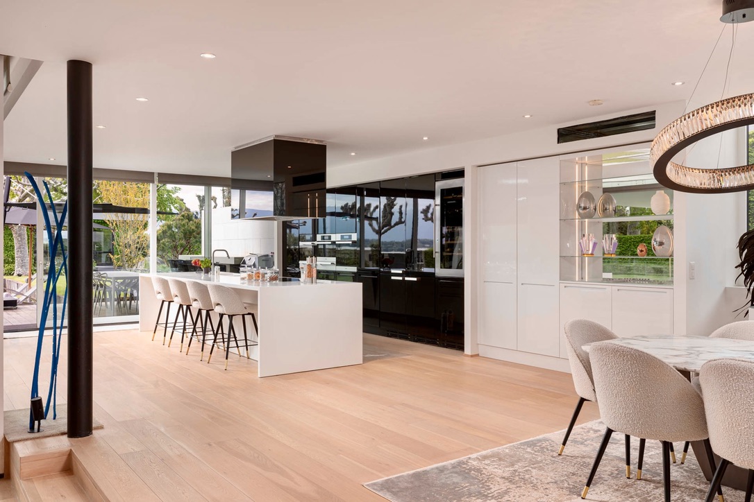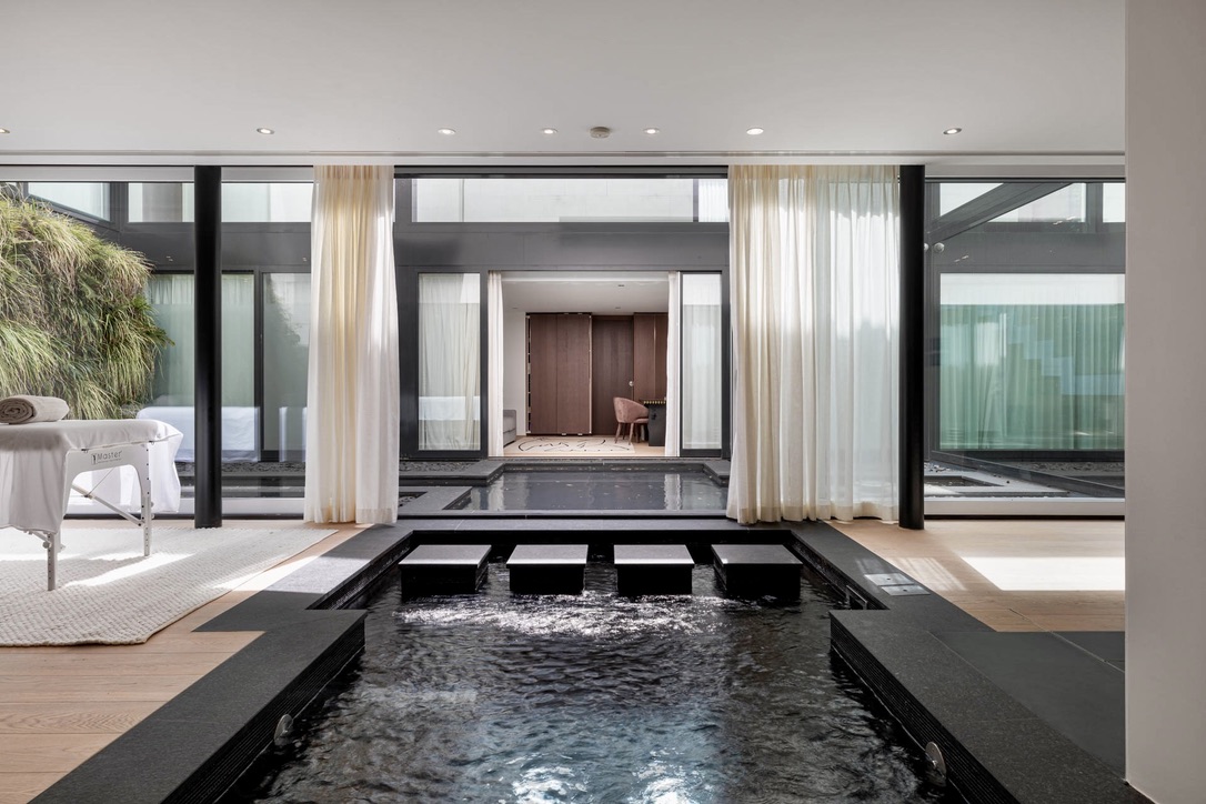 Wake up in one of the five spacious bedrooms. Each bedroom features contemporary design, an ensuite bathroom, and a dressing room. Furthermore, start your day with a refreshing dip in the heated outdoor pool. The pool area, surrounded by lush greenery and the calming sounds of nature, enhances the Geneva lakeside rental experience. Thus, Villa 8Lake stands out with its exclusive amenities.