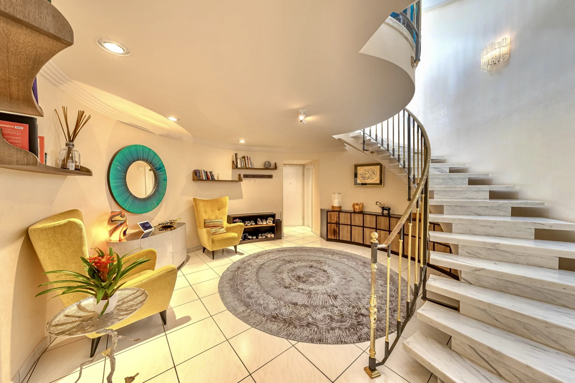 The villa’s architectural design offers a seamless blend of luxury and functionality. Large, sunlit living spaces, high ceilings, and premium materials define the interior. The sumptuous staircase serves as a centerpiece, gracefully connecting the villa’s multiple levels.