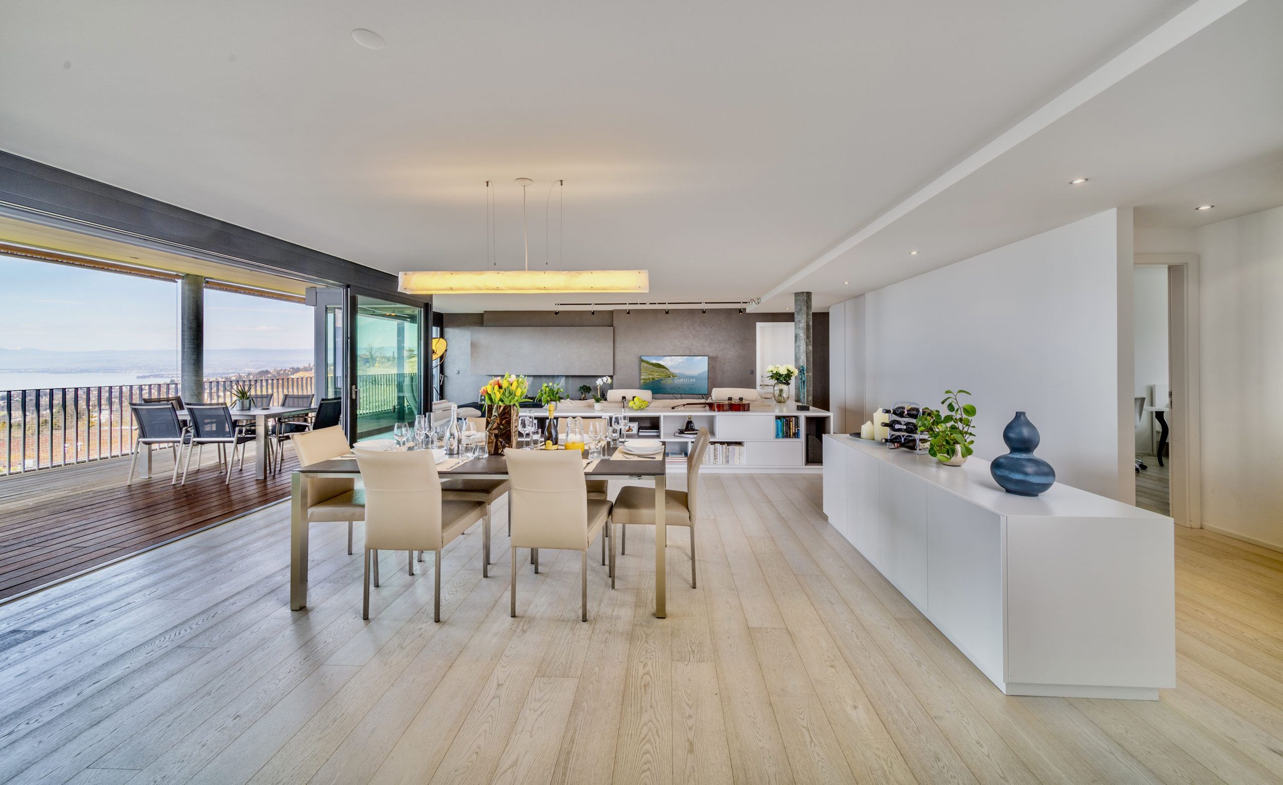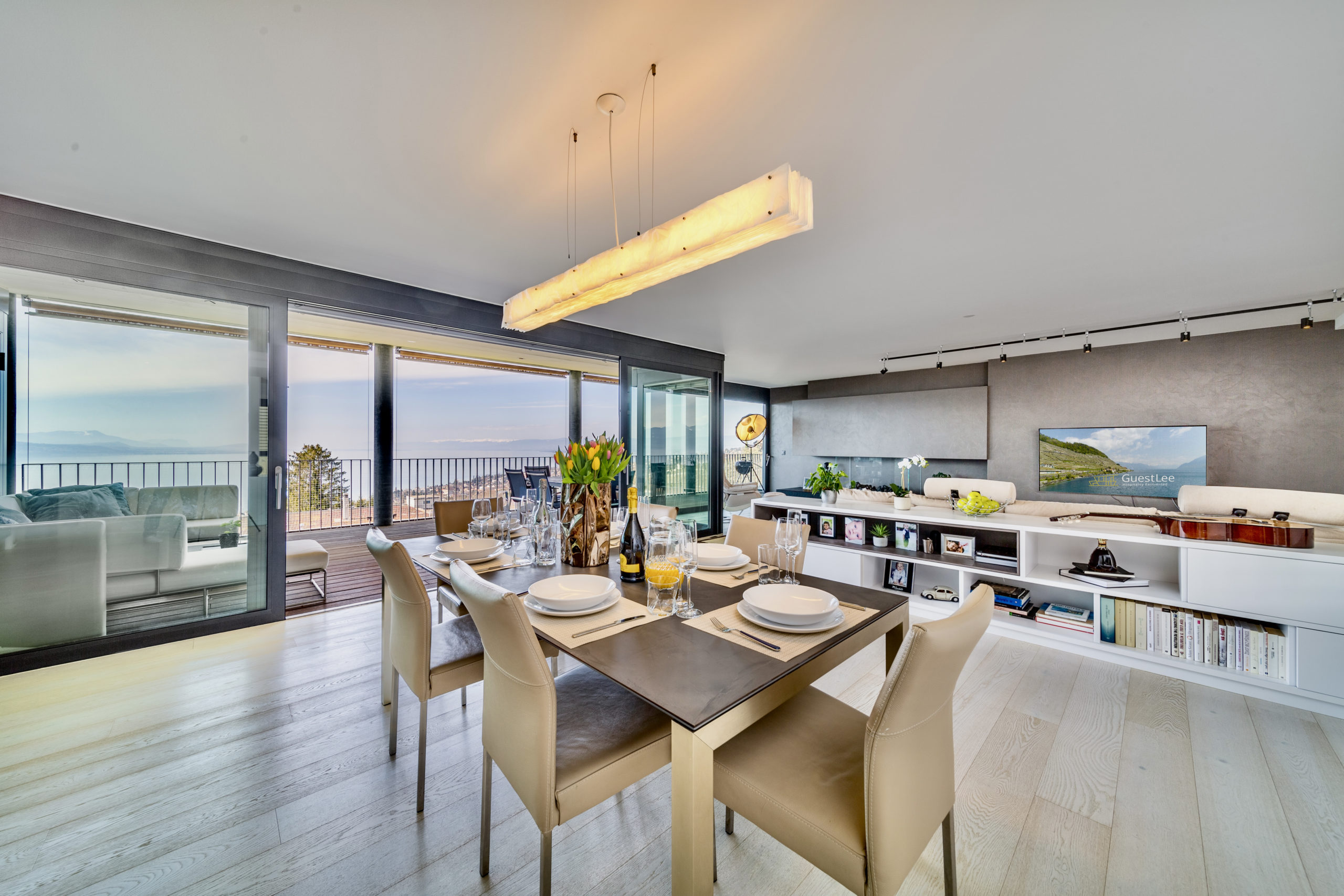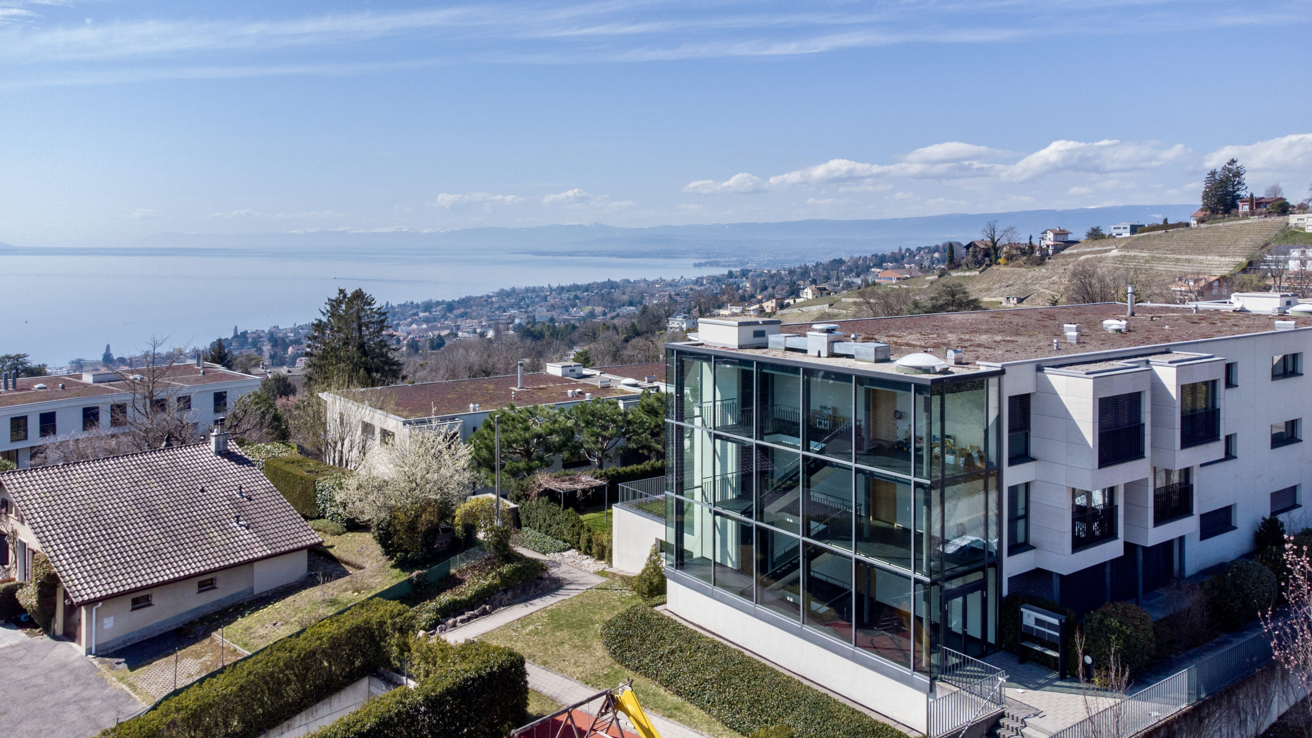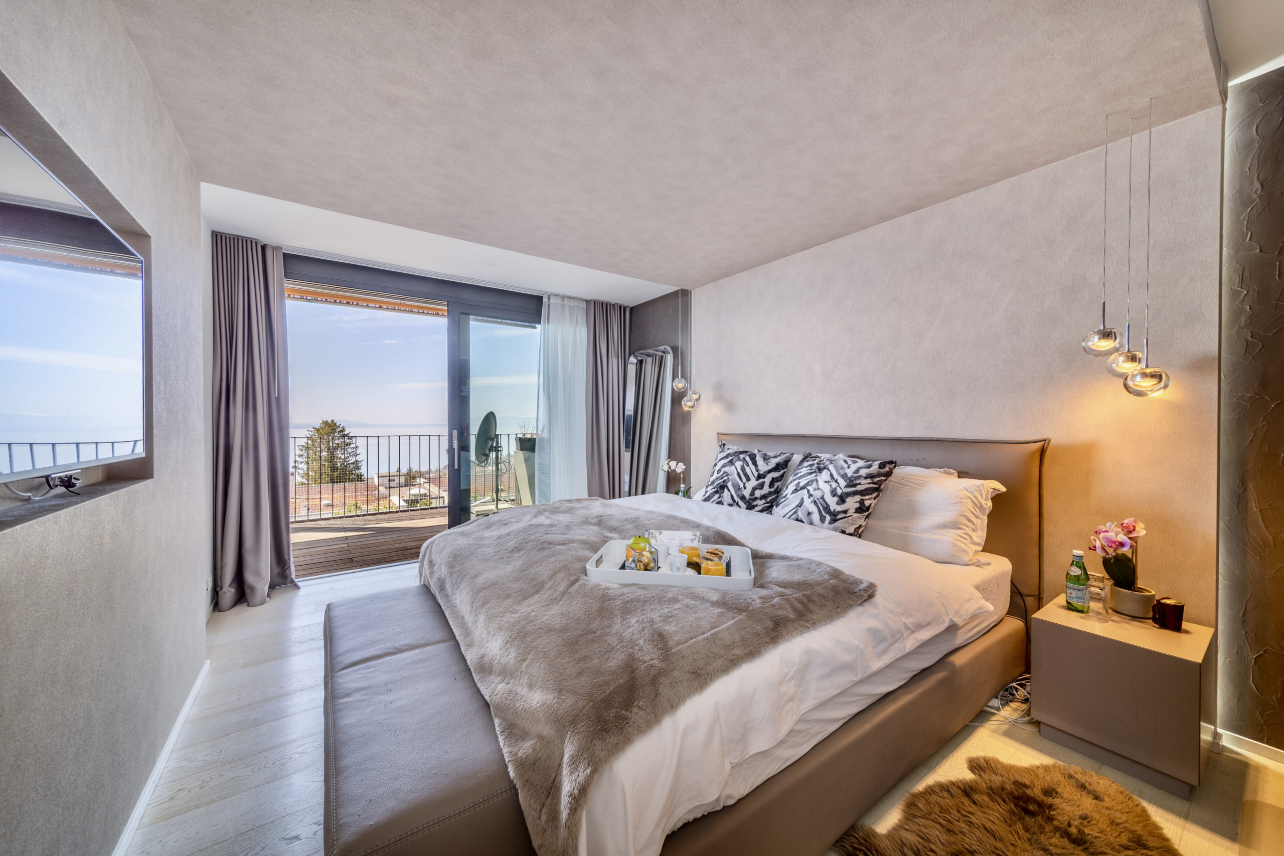 This extravagant penthouse is spread over 200 sq.m2 offering complete privacy and uninterrupted lake views of the Leman and the Swiss Alps.