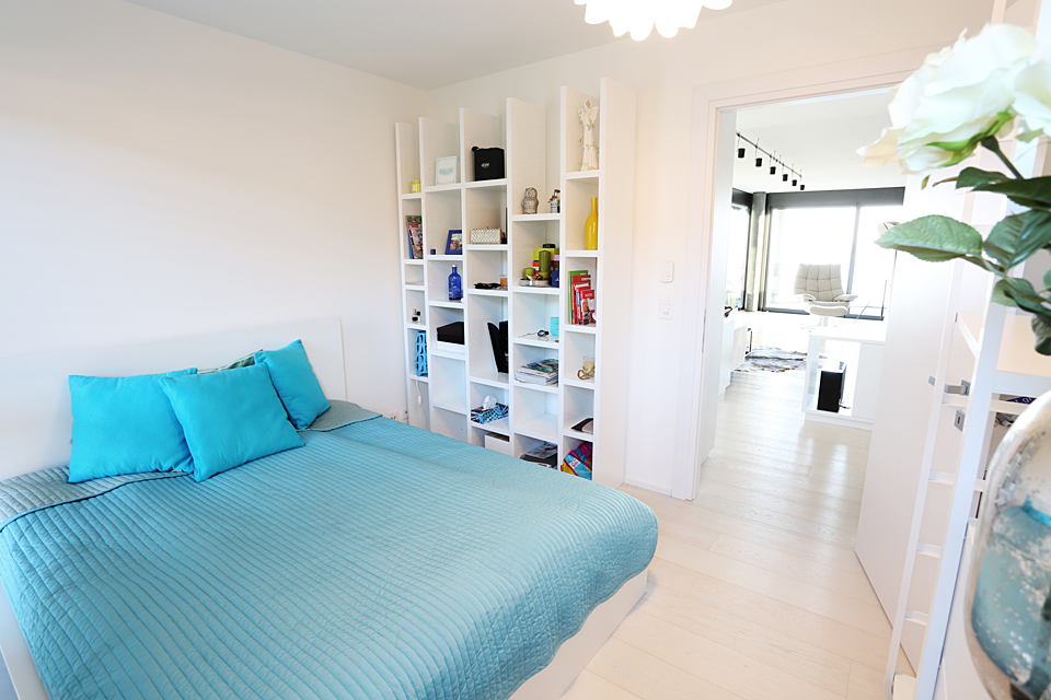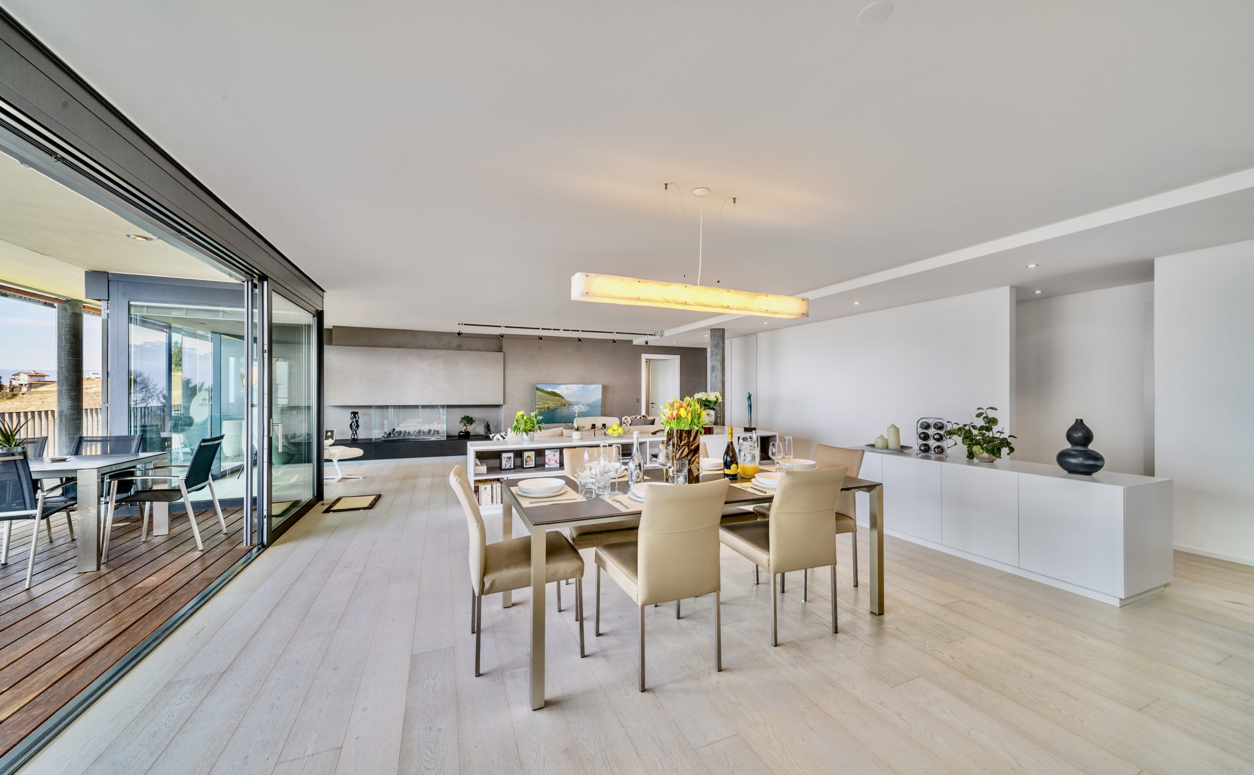 A fully equipped and open kitchen with a view and cabinets with appliances complete this impressive home. In addition to the open dining area fit for 8 people, the stunning and expansive open-plan living area characterize its exquisite interiors highlighted by elegant stone and wood superb finishes. Framed by floor-to-ceiling glass panelling, it bathes in natural light creating an airy and bright atmosphere all throughout the living space. Only to give you access to the all surrounding 120 sq.m2 terrace with panoramic views to enjoy the perfect family breakfast or sunset diner.