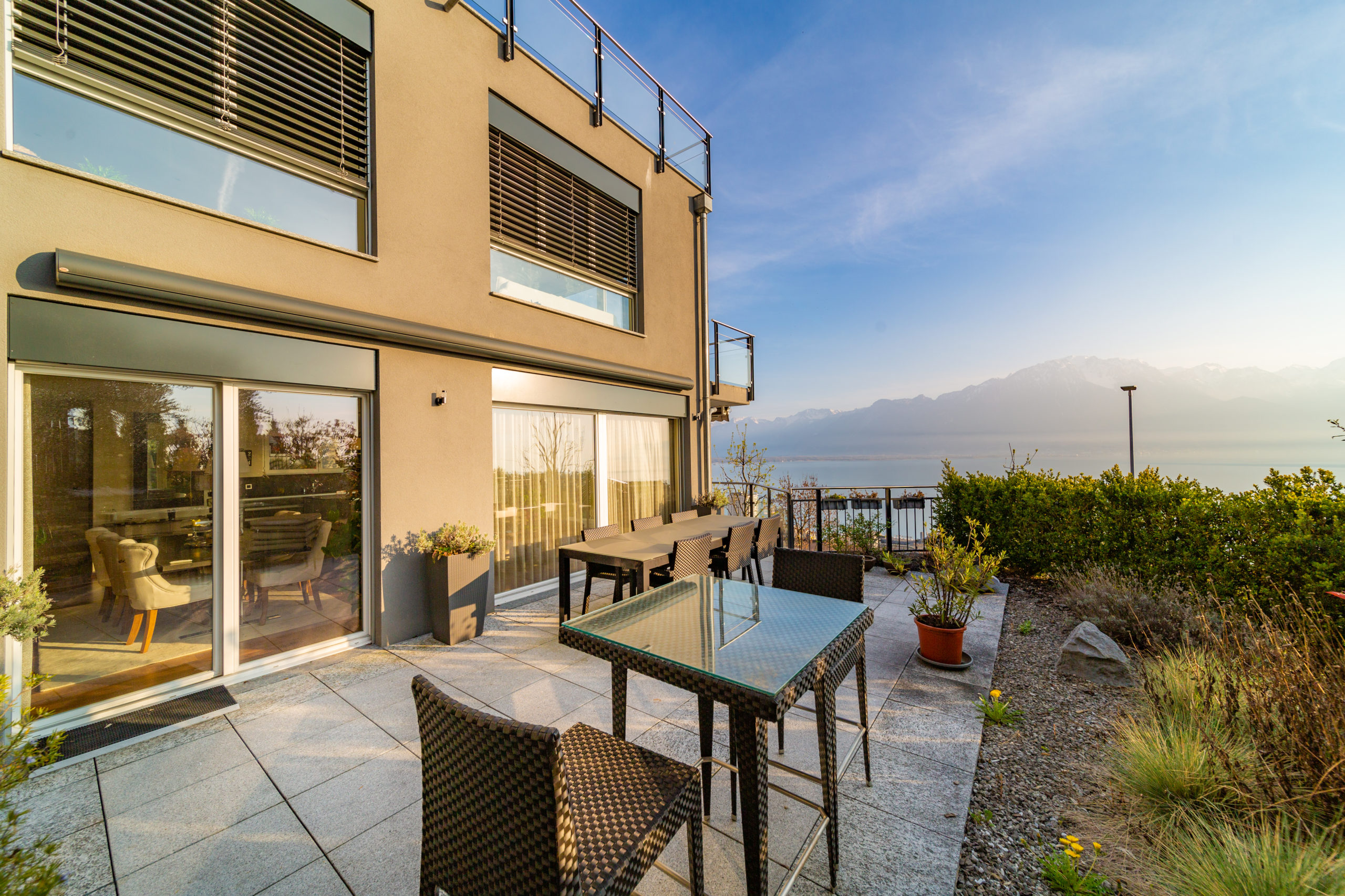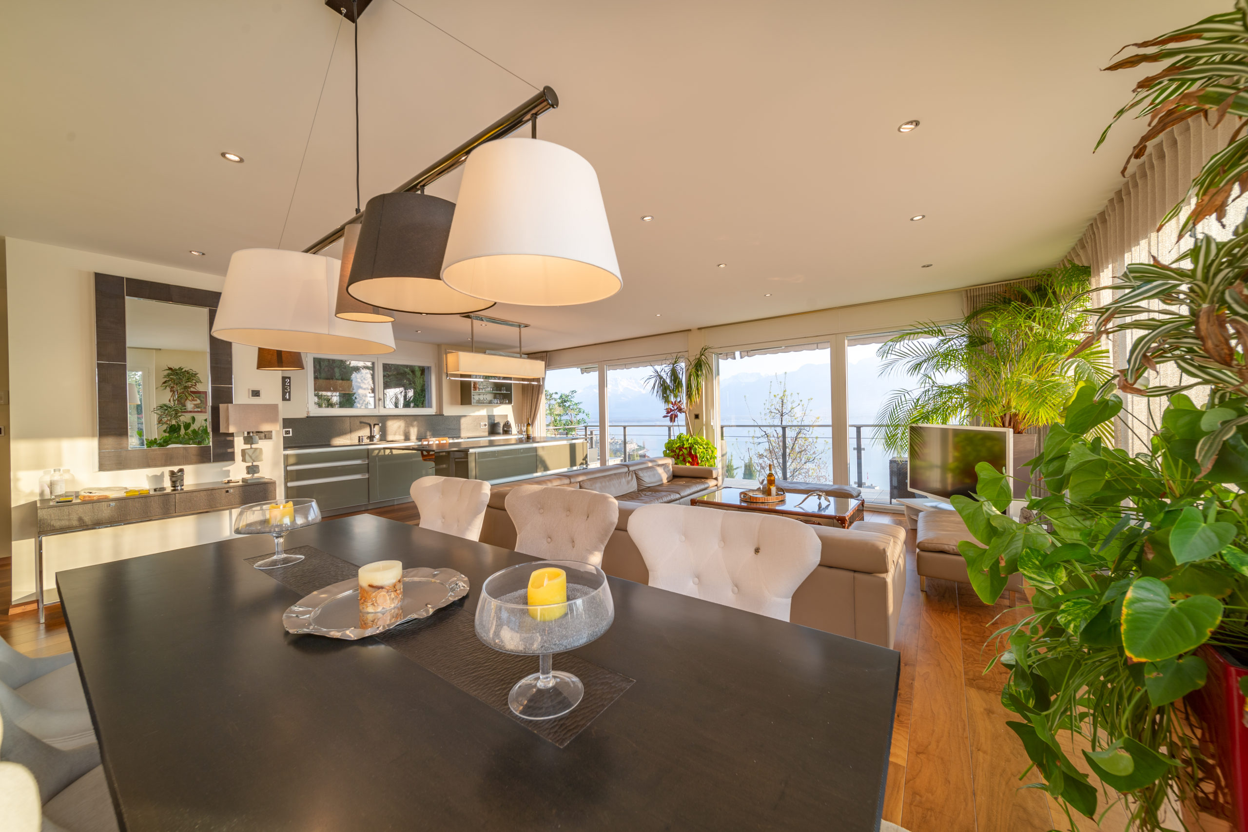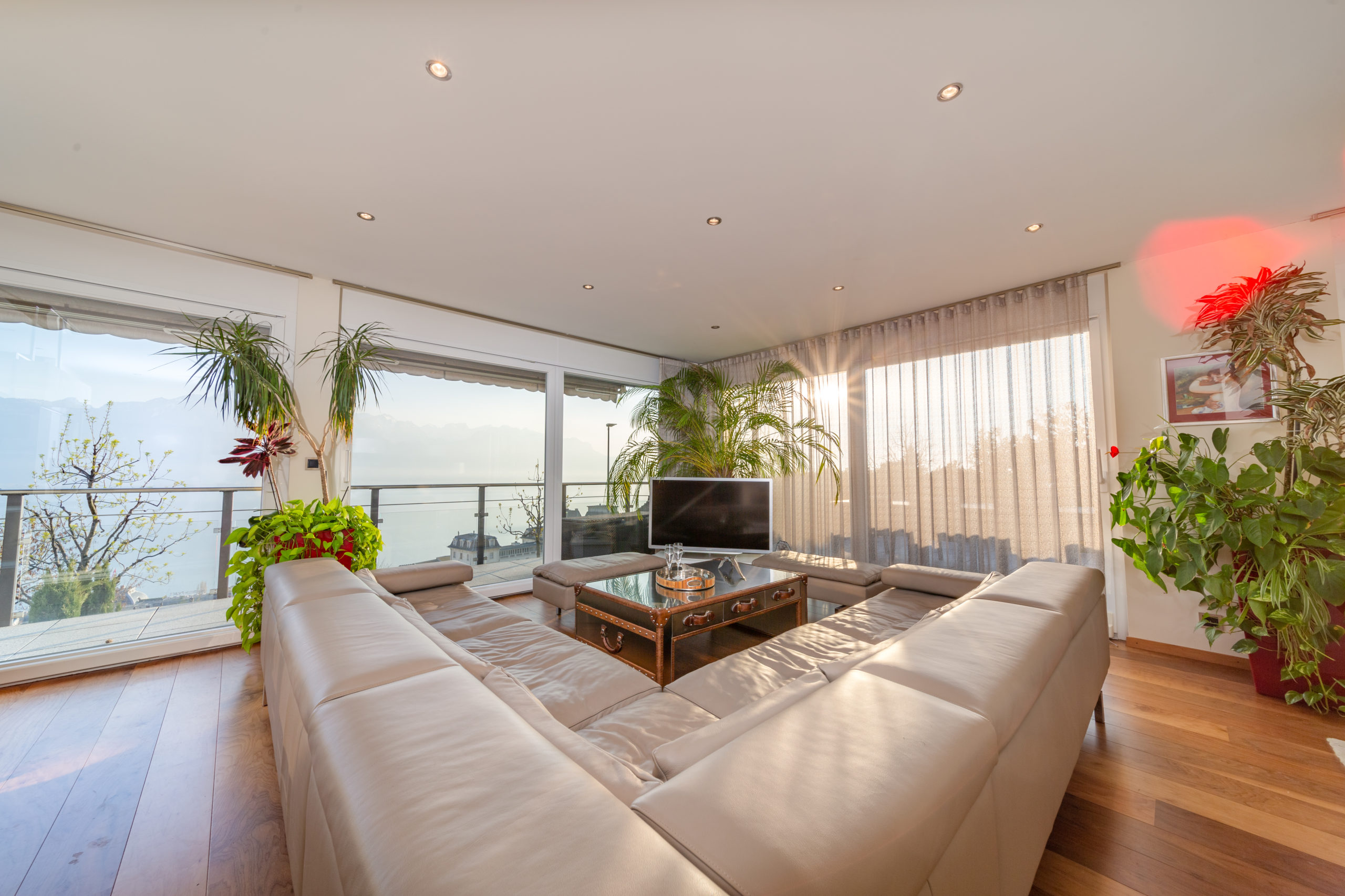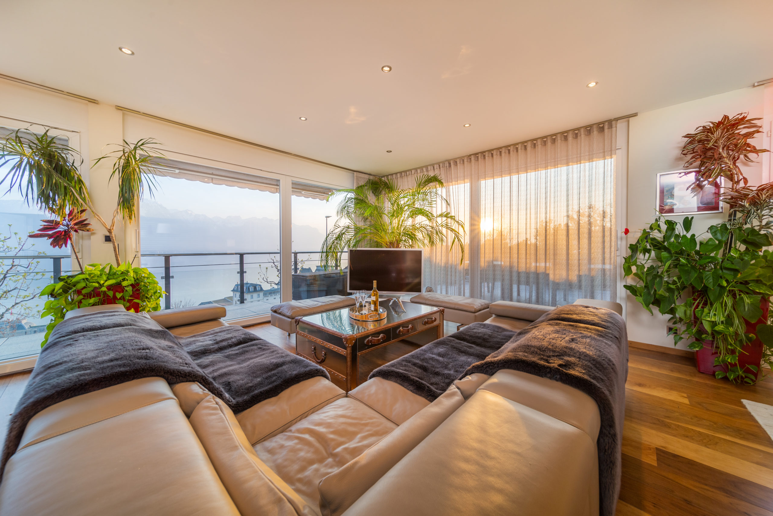 This apartment provides guests with excellent dining space, a spacious living room, a large fully equipped kitchen, 1 double bedroom suite, and one spacious private balcony with panoramic view of the Swiss Alps and the Geneva Lake with a hot jacuzzi in the terrace with panoramic views, plus one indoor parking.