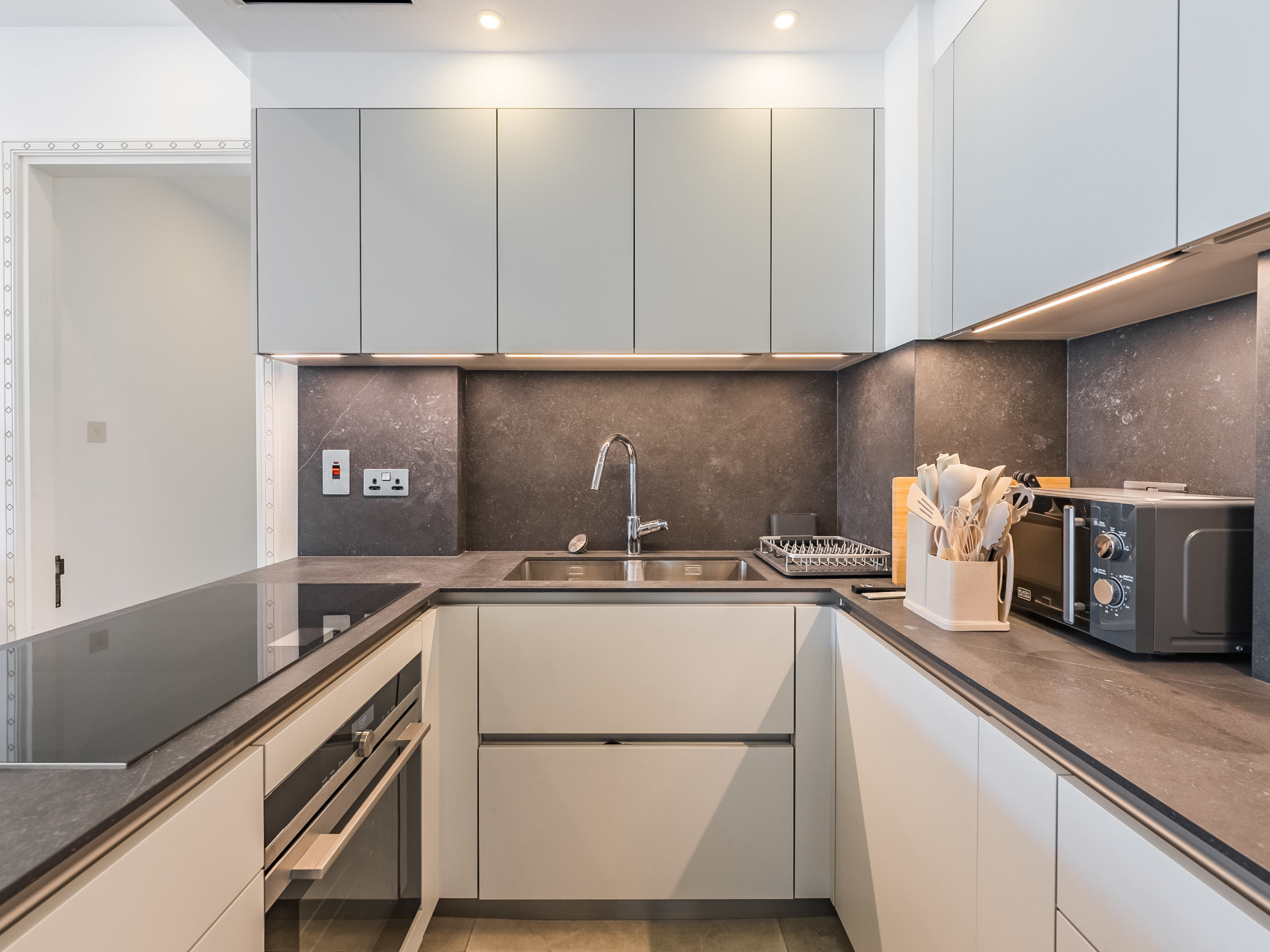 The fully equipped kitchen is perfect for home-cooked meals, complete with cooking essentials, pots, pans, and premium appliances. The elegant dining area and lounge space provide a stylish setting to unwind, while floor-to-ceiling windows let in abundant natural light, offering breathtaking city views.