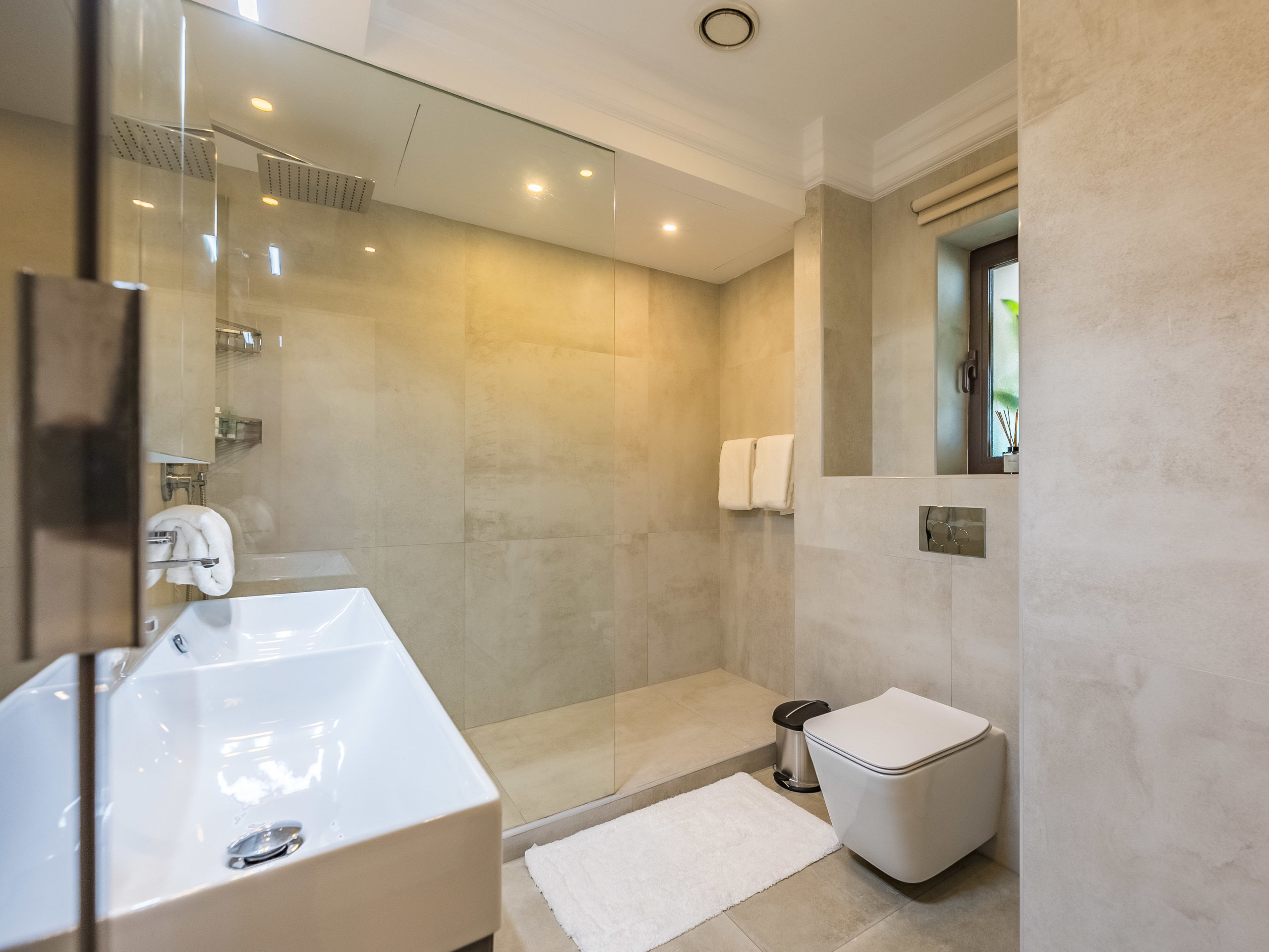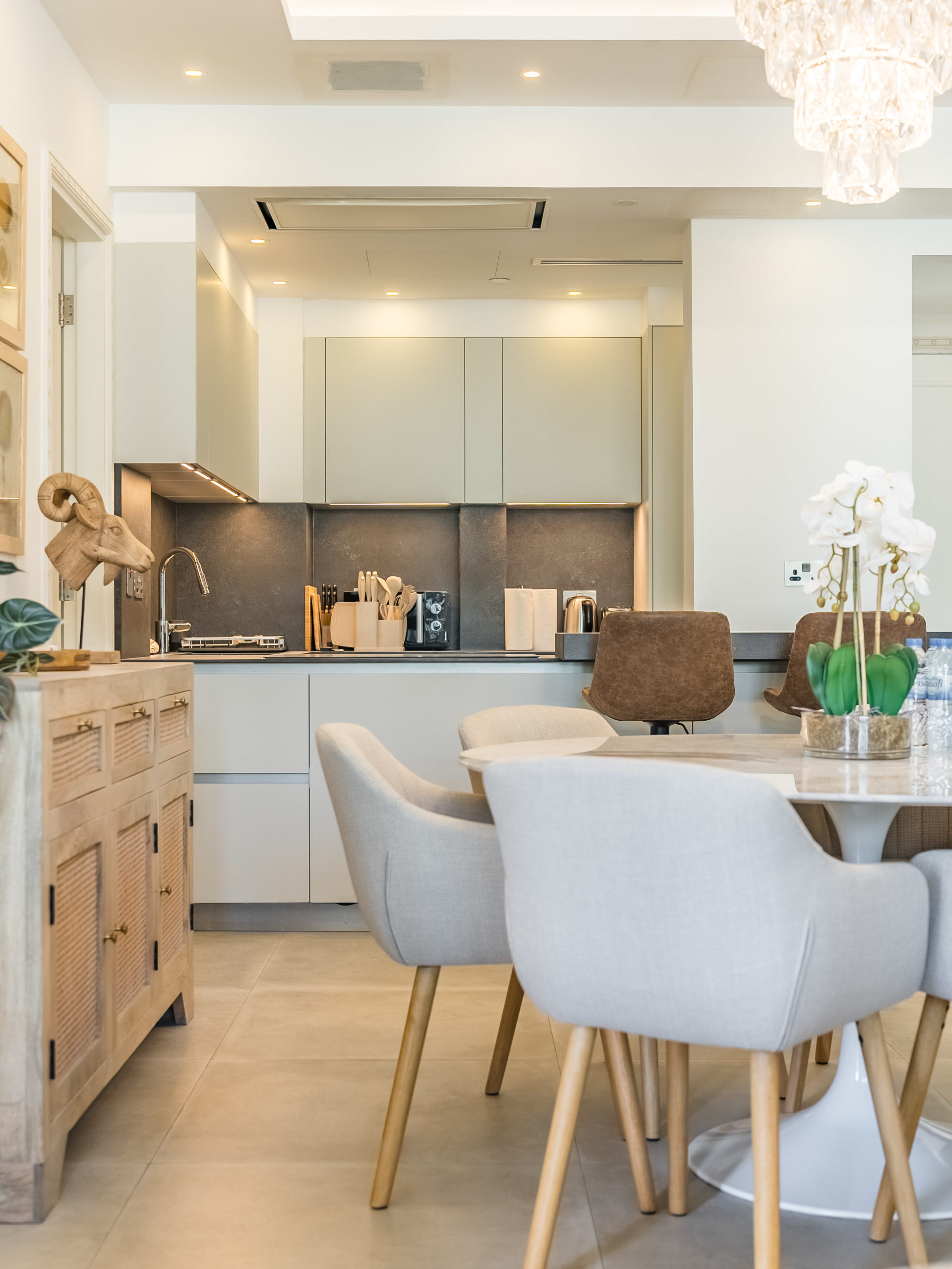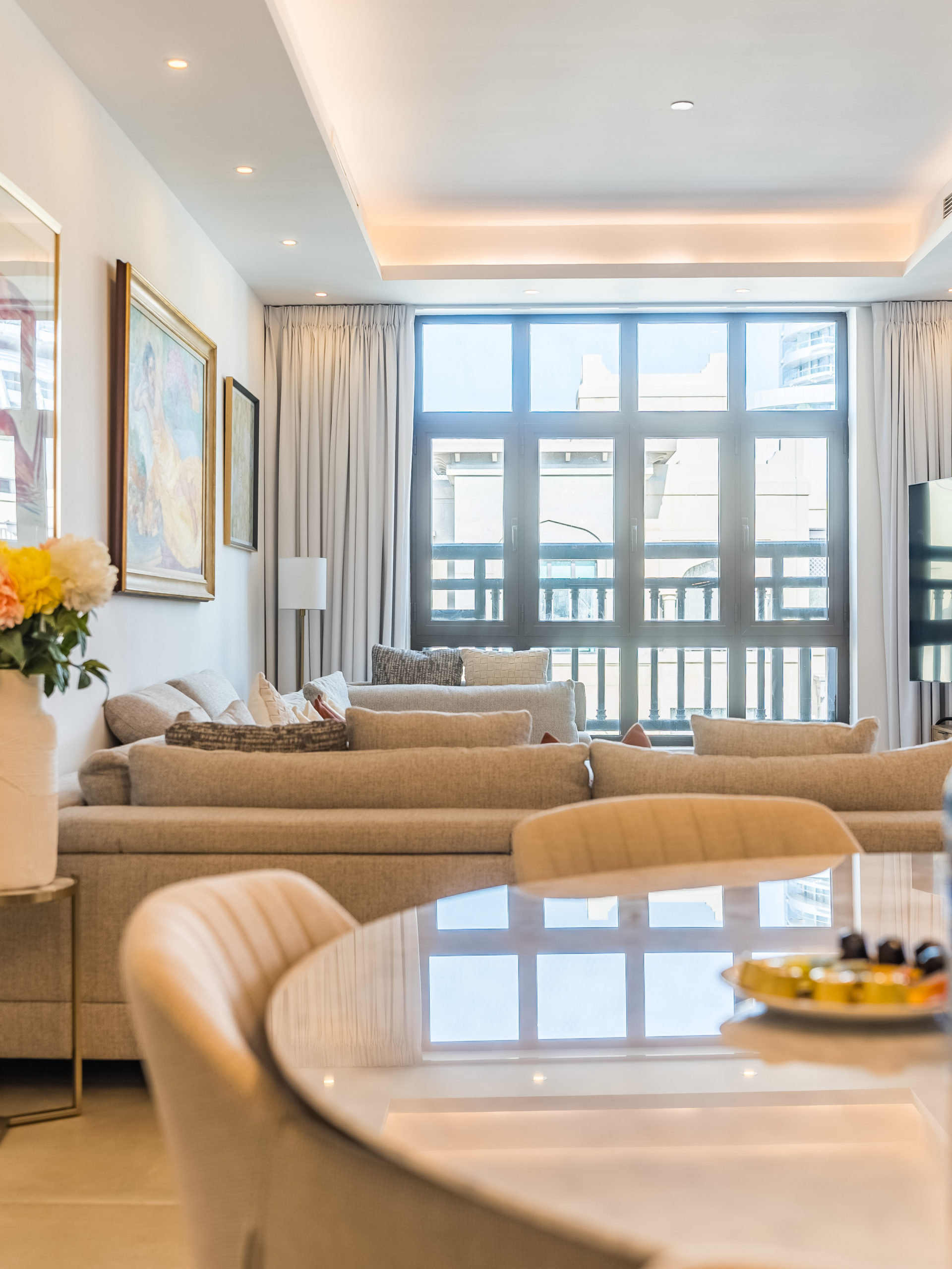 The two main bedrooms are fitted with queen-sized beds, ensuring a restful stay. The maid’s room, which can be used as an additional sleeping space, adds flexibility for families or small groups. The apartment’s two modern bathrooms feature high-end fixtures, providing a spa-like experience with sleek designs and premium finishes.
