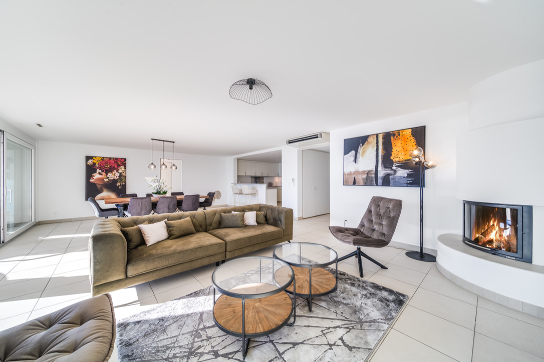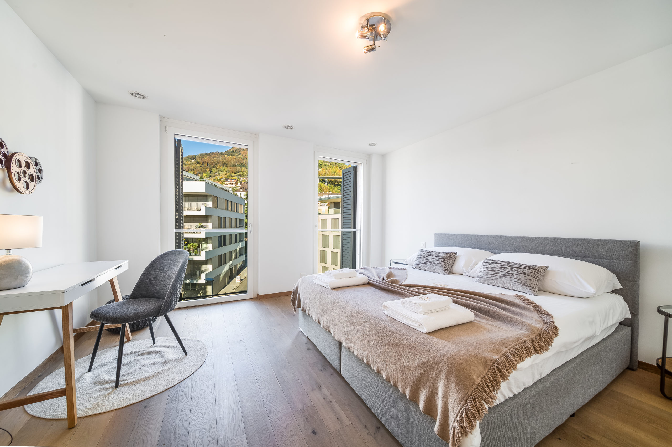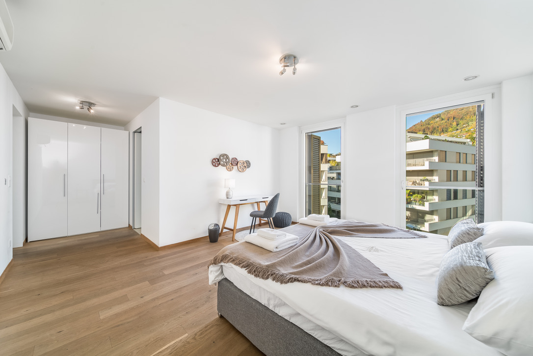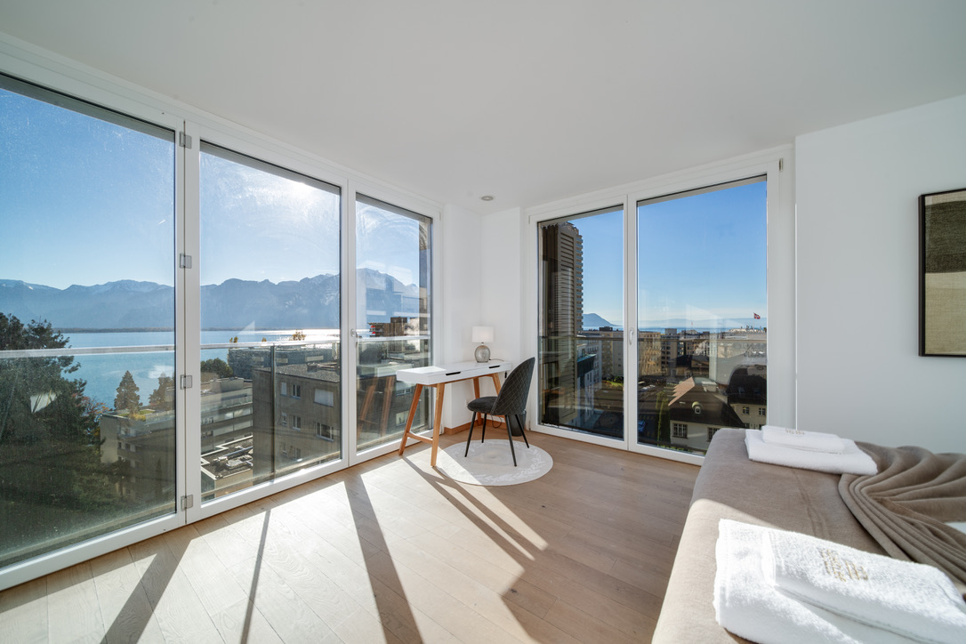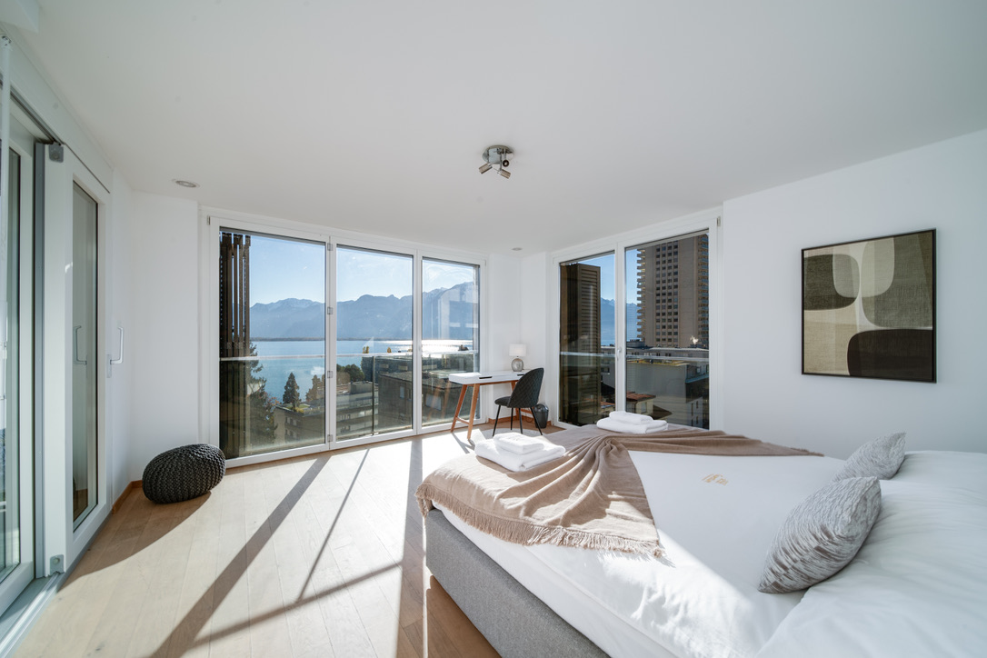 Experience panoramic views in the heart of Montreux—ideal for your family holiday on the Swiss Riviera. This modern, bright, and spacious 4-bedroom, 3.5-bathroom apartment features wooden floors and abundant natural light. Enjoy a large, stylish living room, a beautiful glass dining table seating 8, big screen TVs with Netflix, a fully equipped kitchen, and parking for 2 cars.
