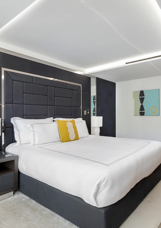 The clean-line architecture is synonymous with the South of France, but inside is something completely unique. White and grey marble, neutral beige furnishings, and wooden floors. And no luxury villa would be complete without incredible artwork. A life-size tyrannosaurus and a Pterodactyl in the trees – Gregory Bonnard sculptures add a unique quirk to the gardens, and modern, vibrant pieces can be seen throughout the living spaces.