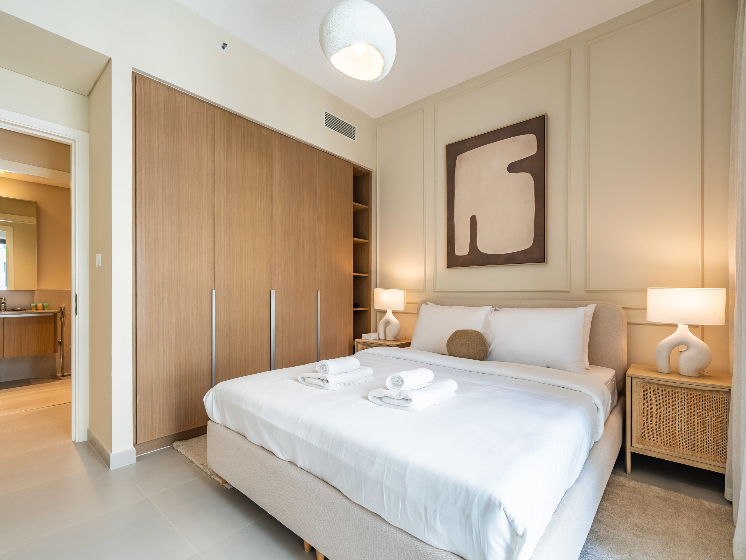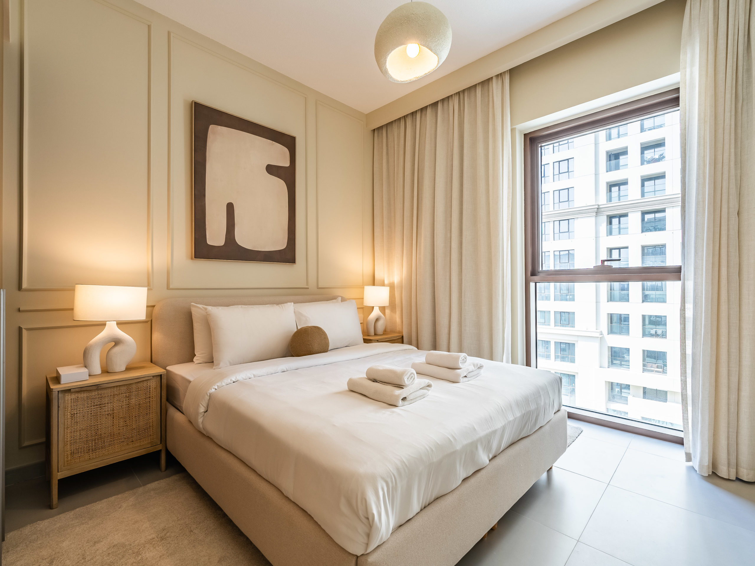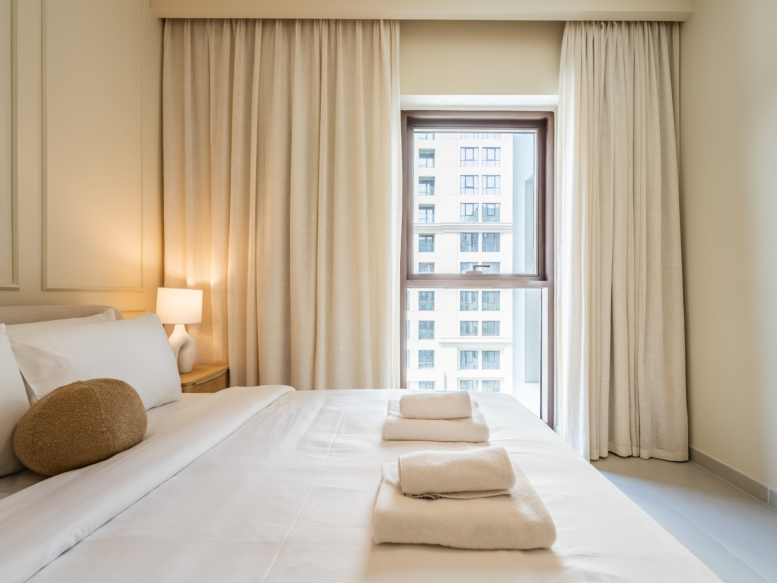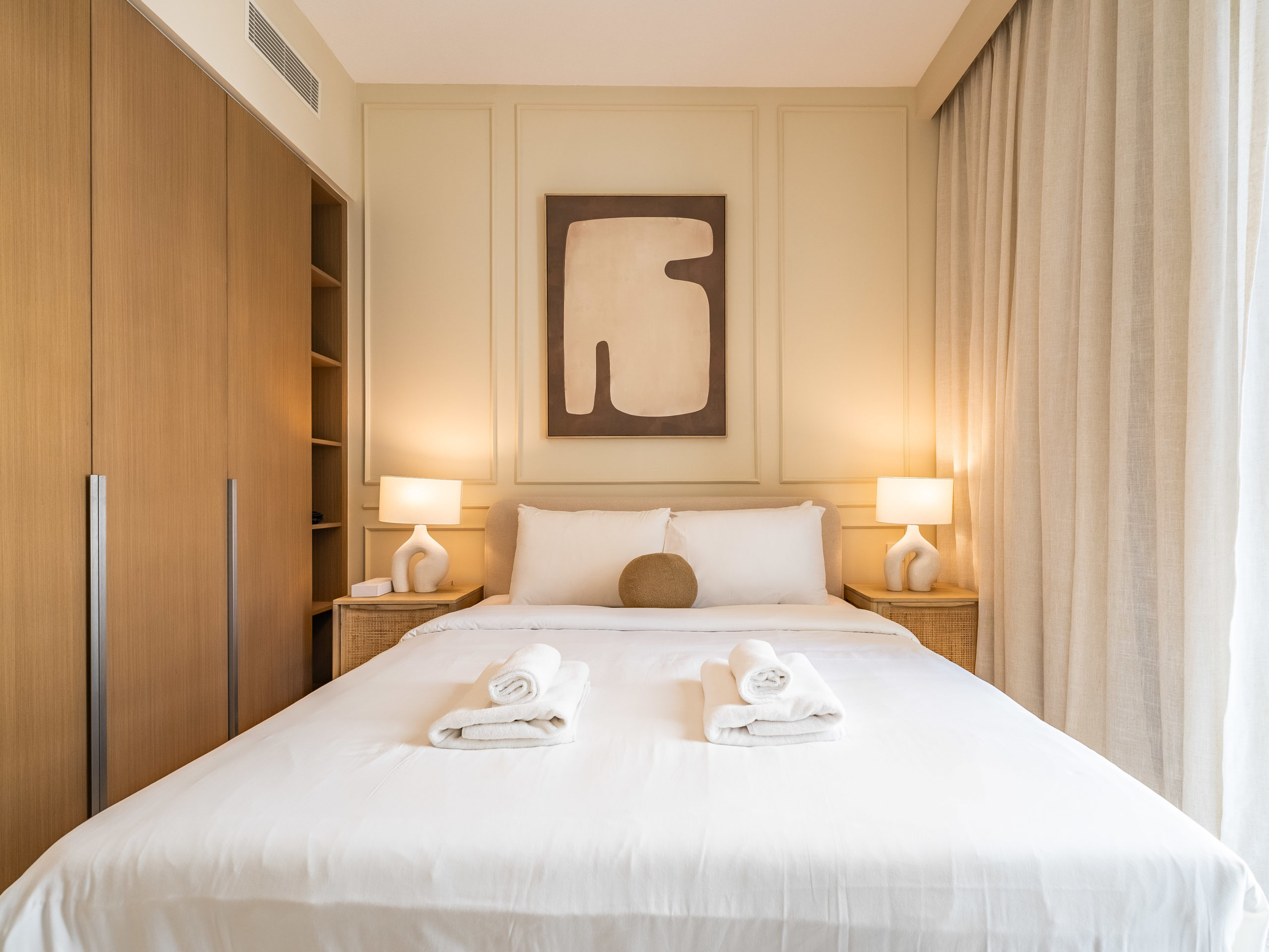 Spacious bedroom with premium bed linens