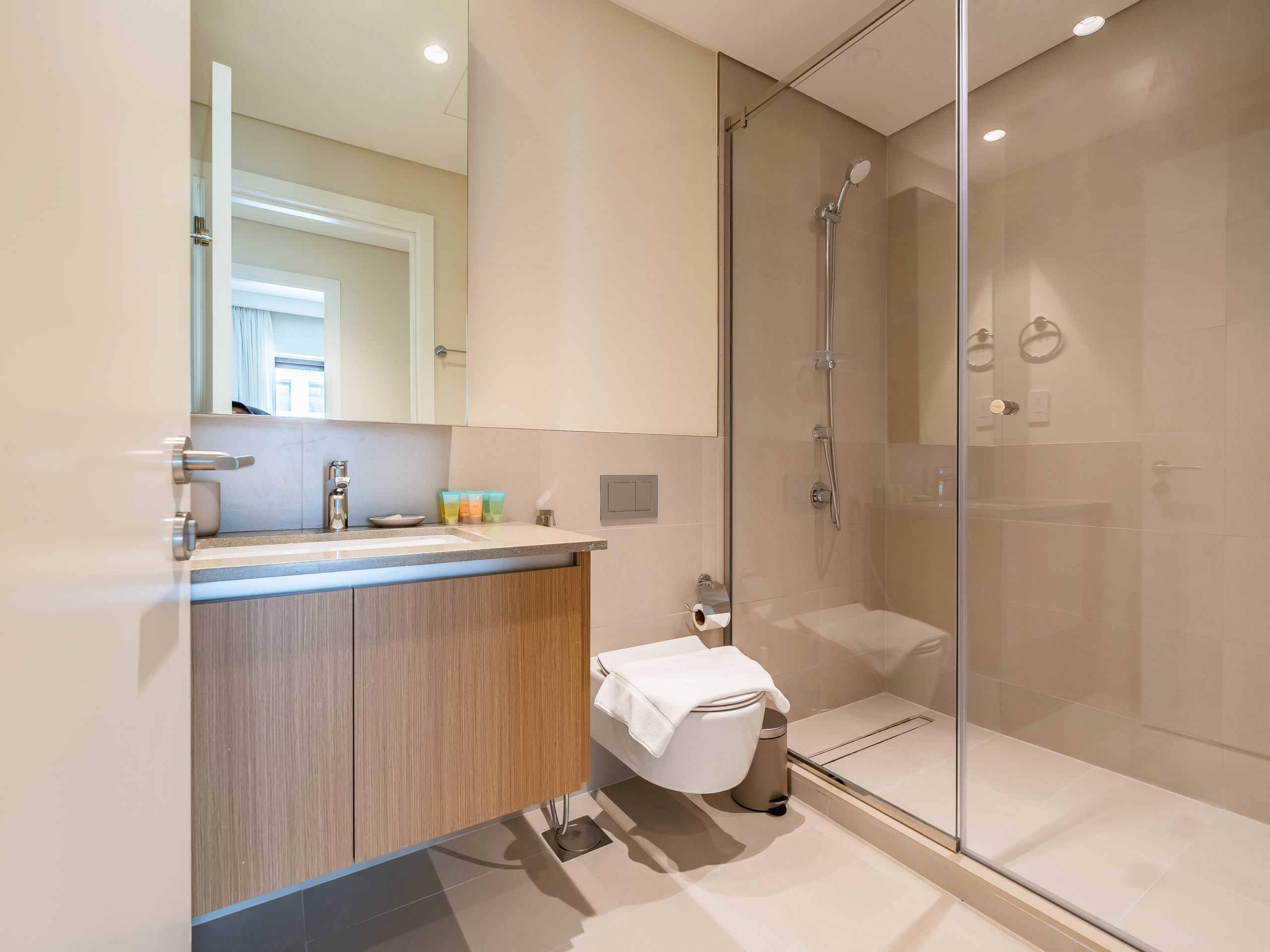 The spacious bedroom is fitted with a plush queen-sized bed, premium linens, and a generous closet for storage. The modern bathroom includes a walk-in shower, bidet, and luxury toiletries, ensuring a spa-like experience.