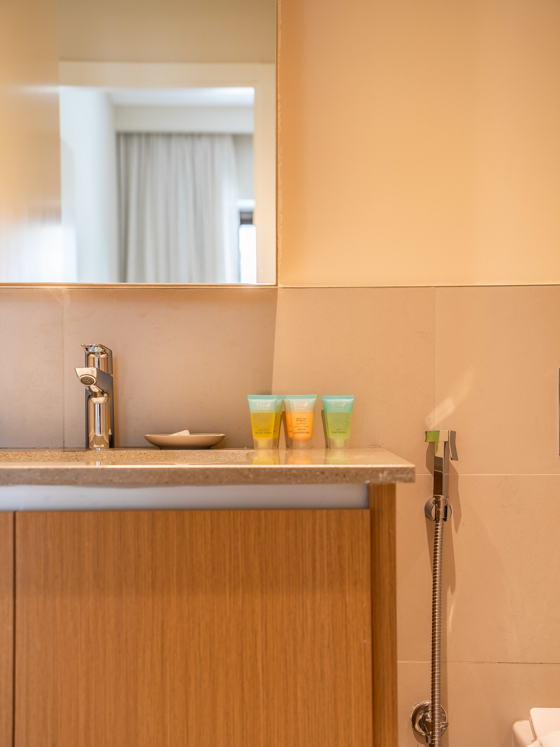Luxury toiletries including shampoo, conditioner, and shower gel