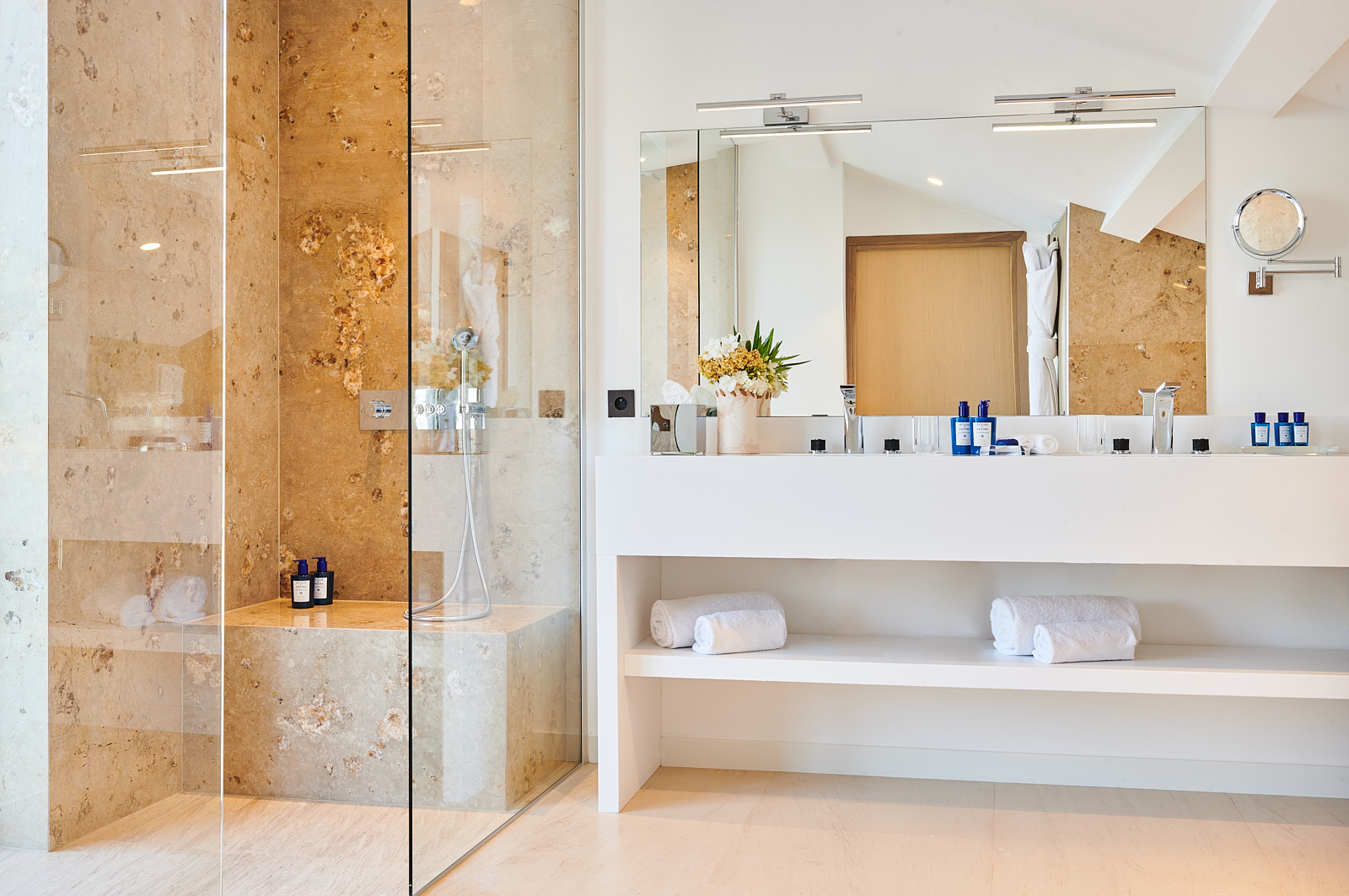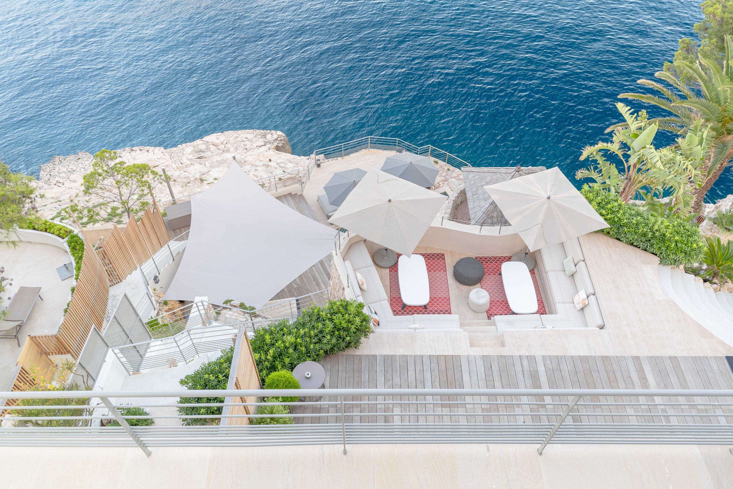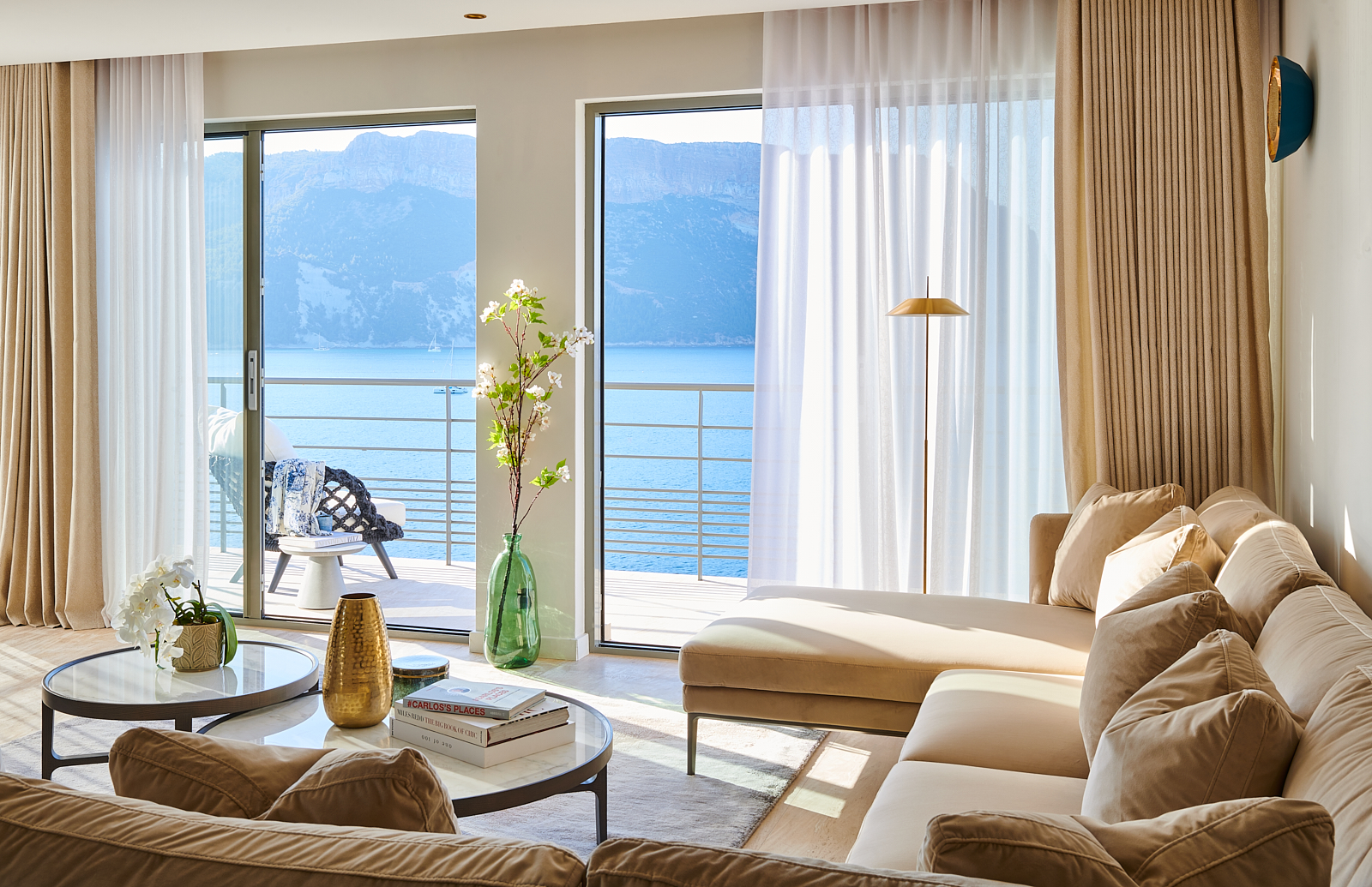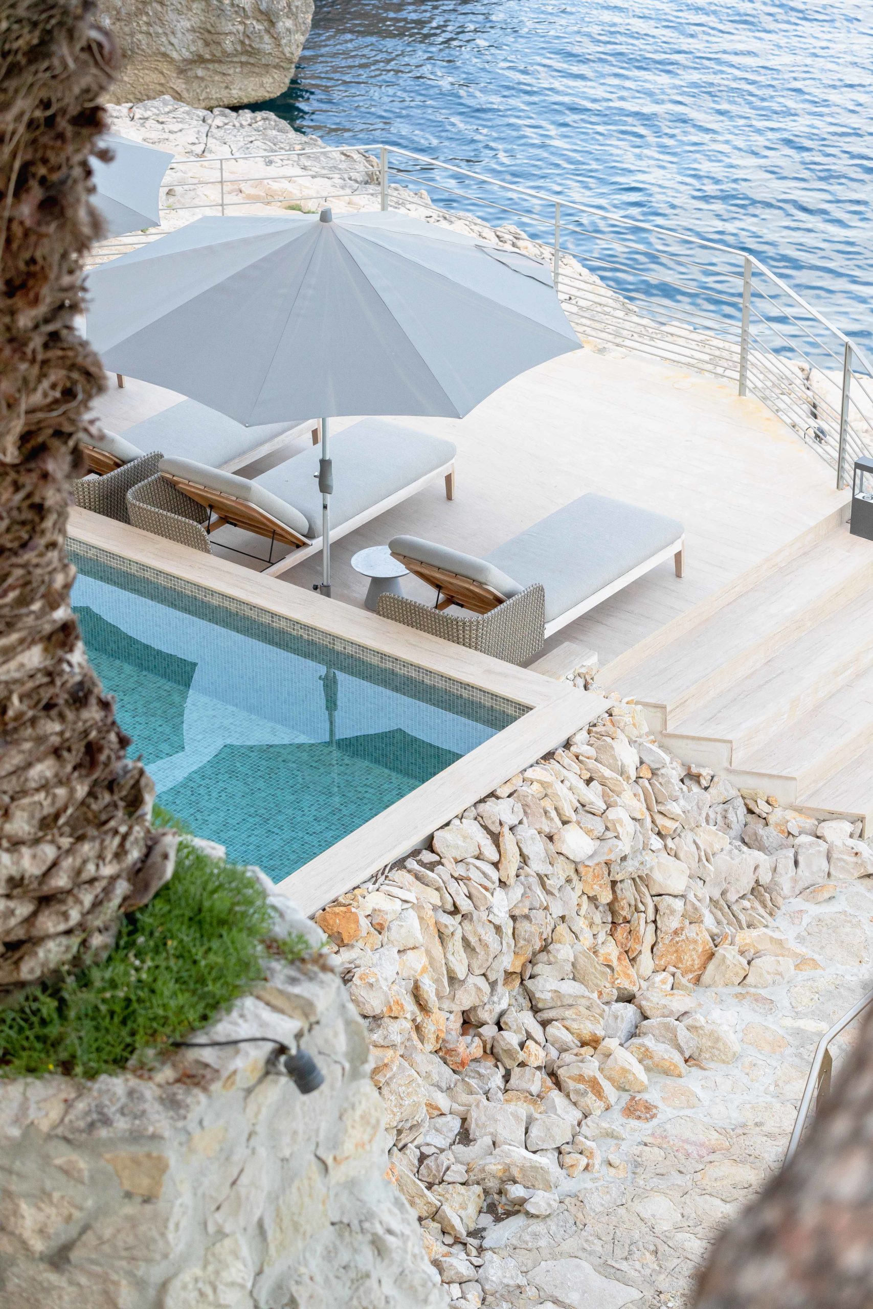 Spanning four levels, the villa’s architecture integrates seamlessly with the surrounding rock. Furthermore, the outdoor spaces invite you to relax and savor the finest art de vivre of the South of France. They celebrate Mediterranean gardens that seem to plunge into the sea. For instance, you can unwind by one of Cala Bianca’s two private heated pools. Whether you choose the pool carved from rock by the sea or the upper pool near the summer lounges, the experience is unforgettable. Inside, minimalist interiors highlight noble local materials. Additionally, four suite-style bedrooms accommodate up to eight guests, each providing a private and peaceful retreat.