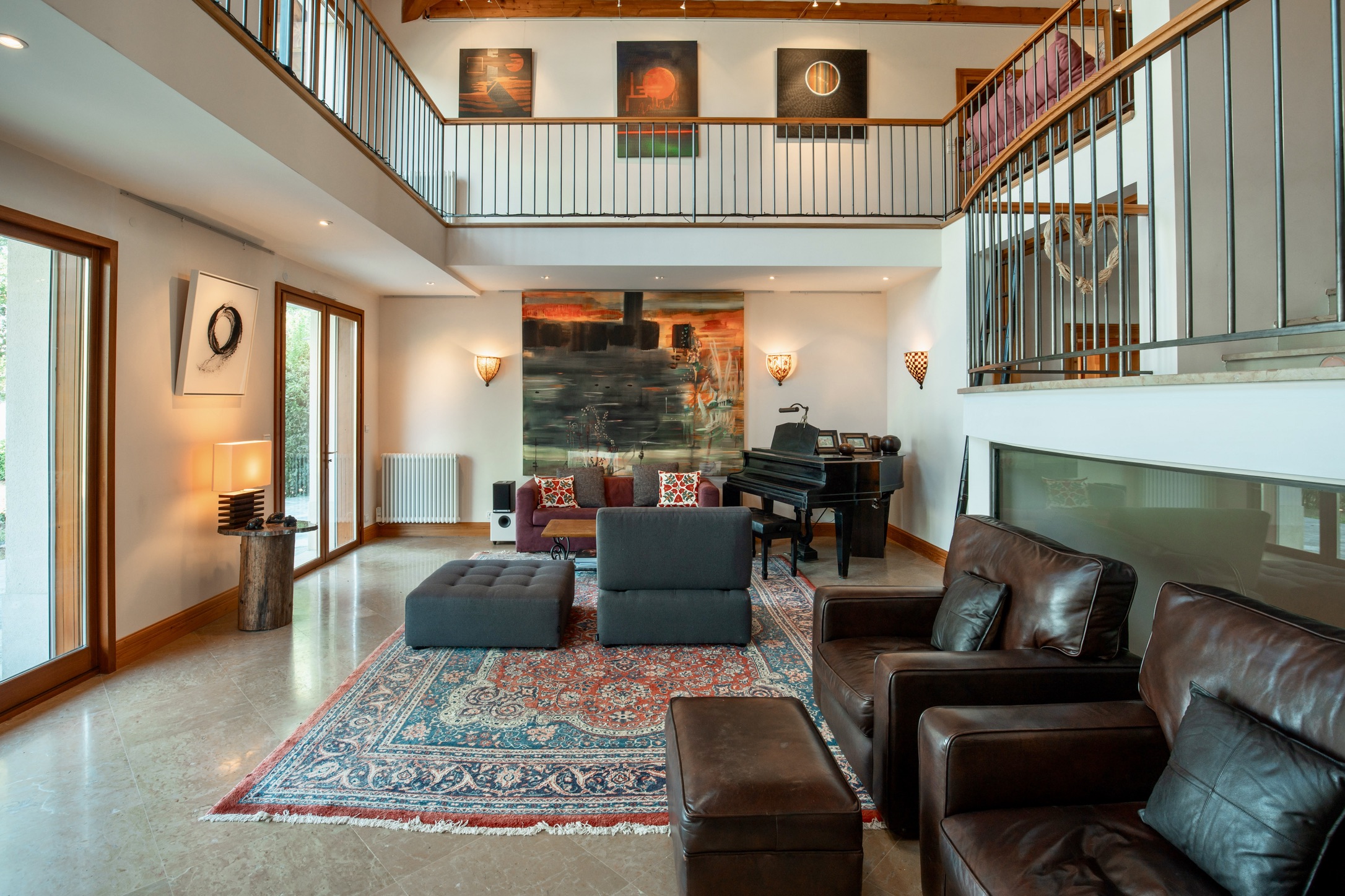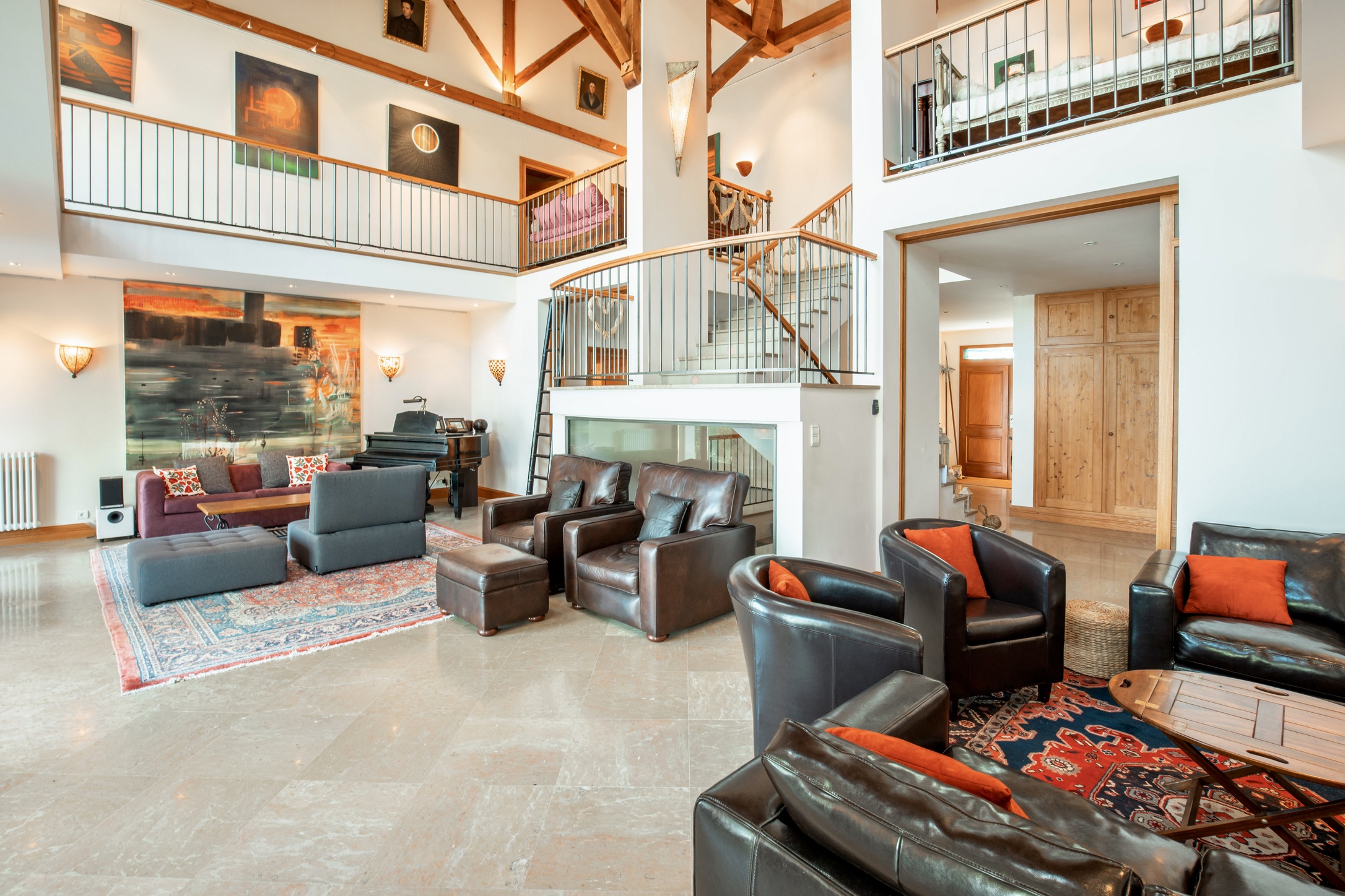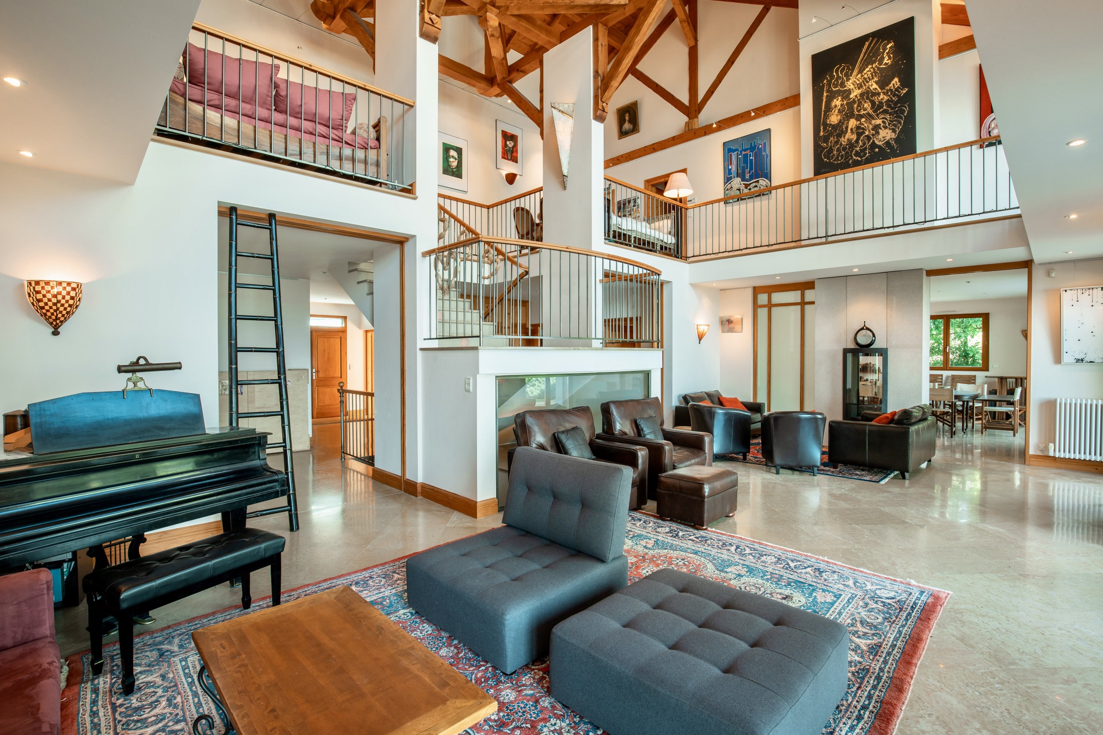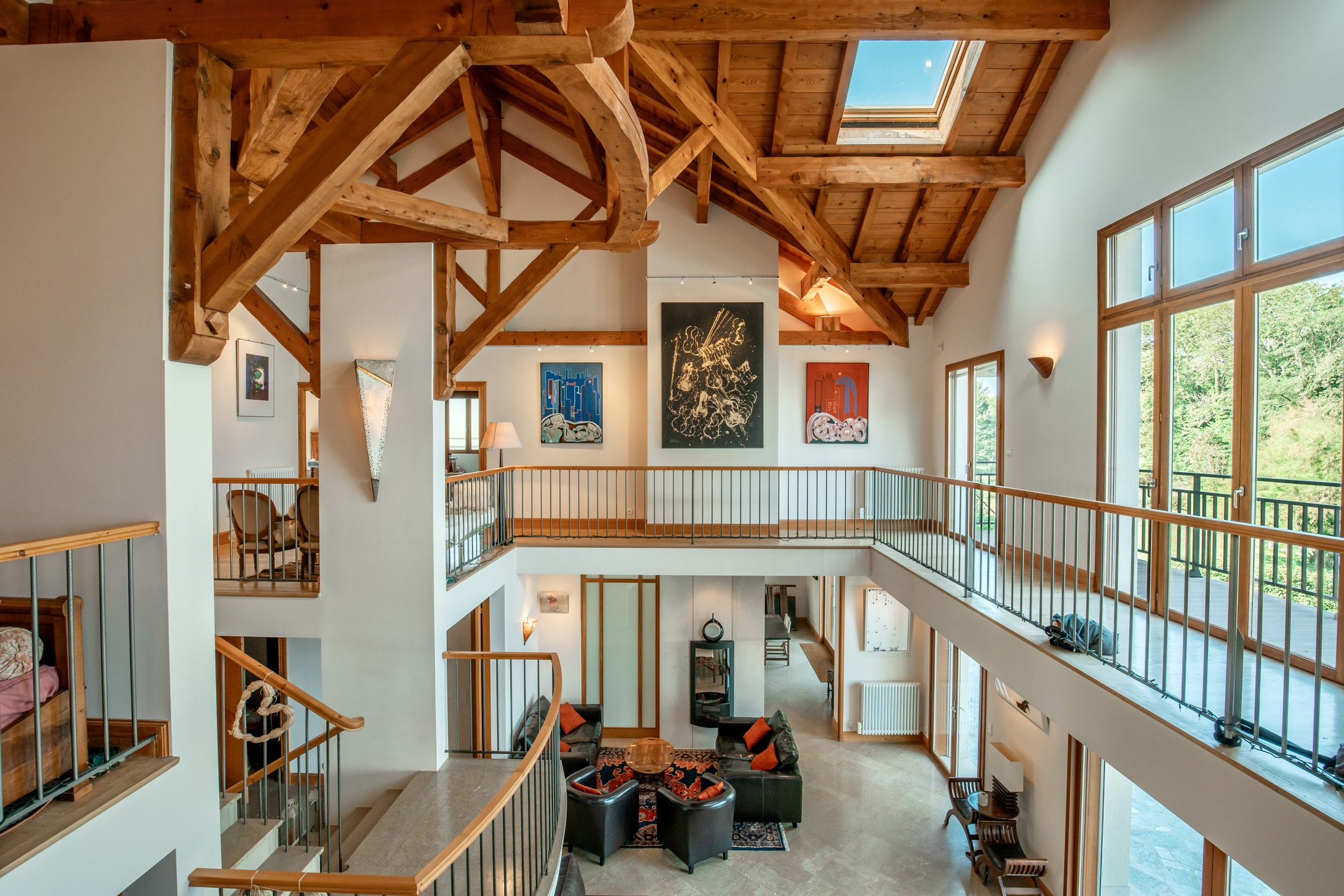• Two double-height living areas, divided by a stunning central open fireplace, create ambiance and warmth