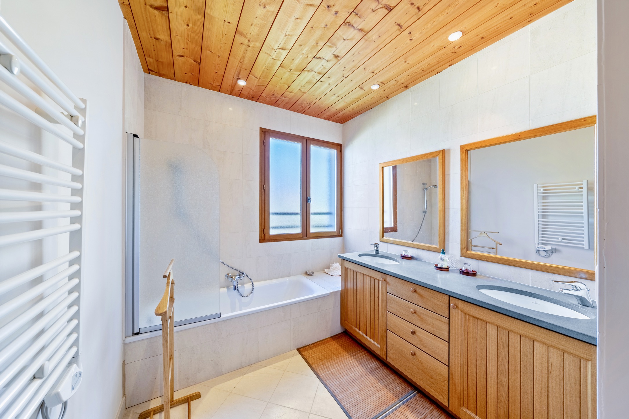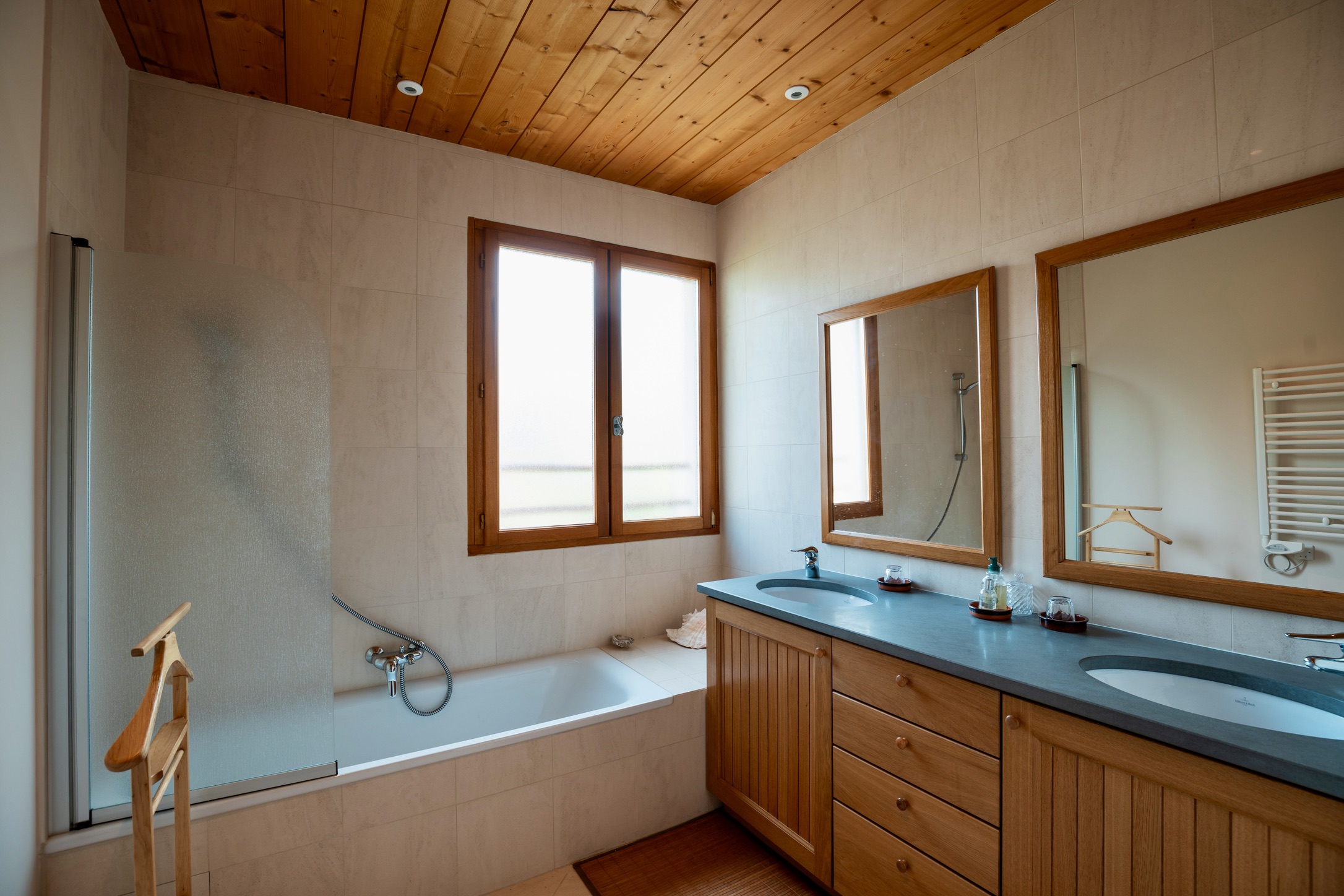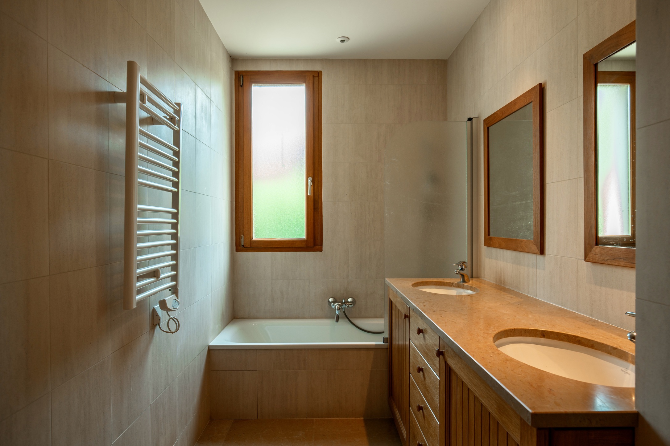 • Underfloor ecological electric heating and double-glazed exotic wood window frames ensure comfort and sustainability