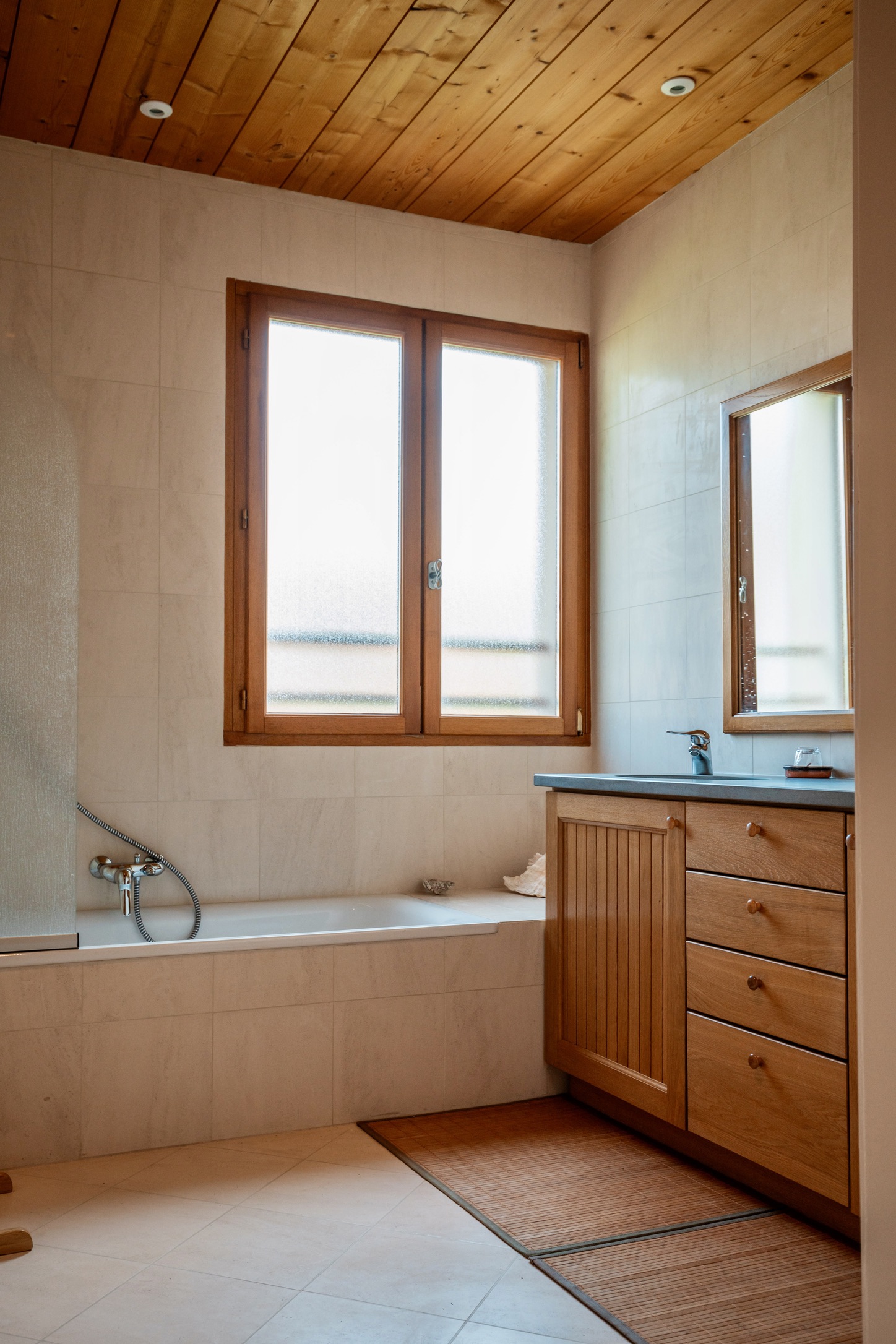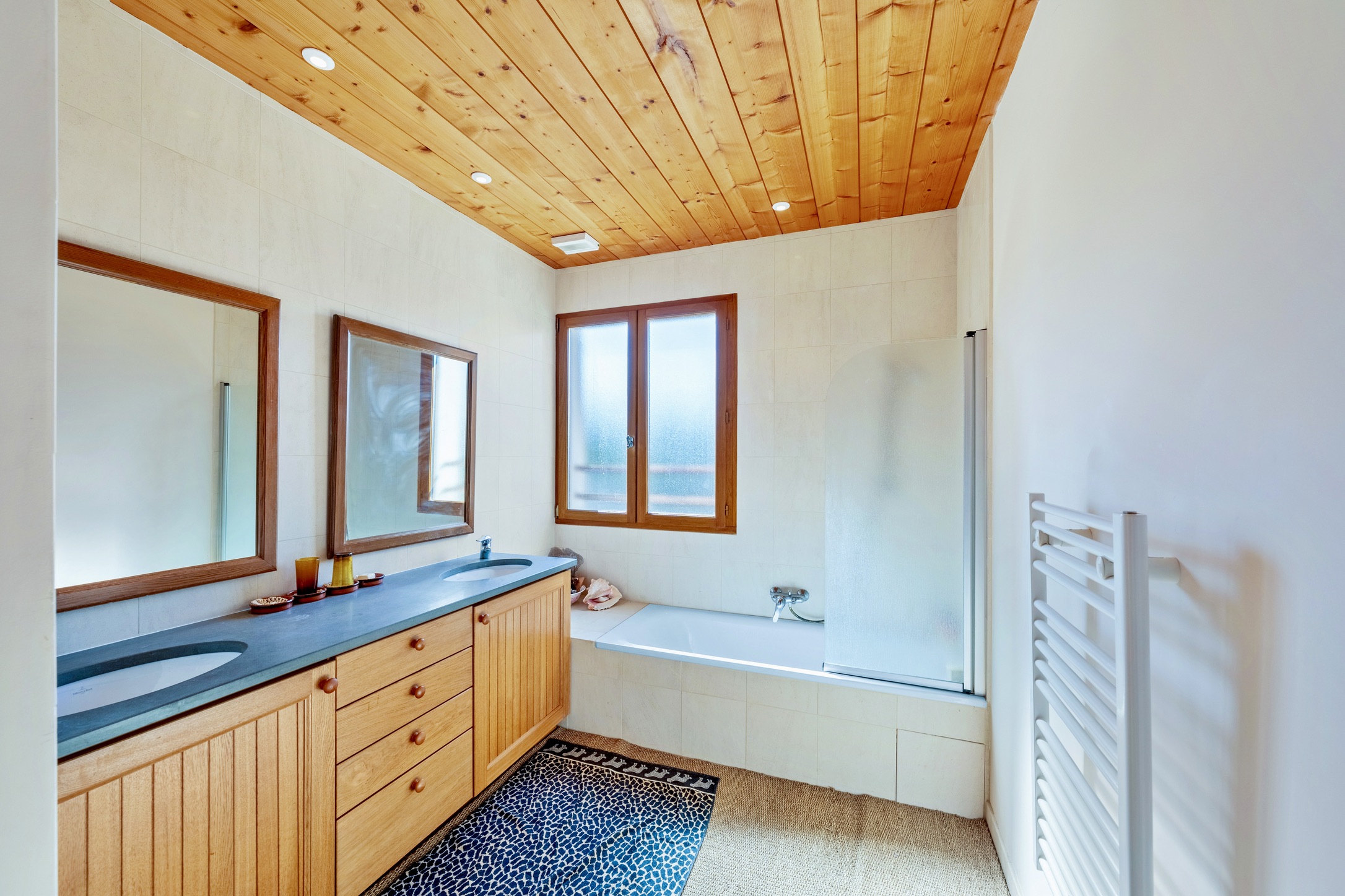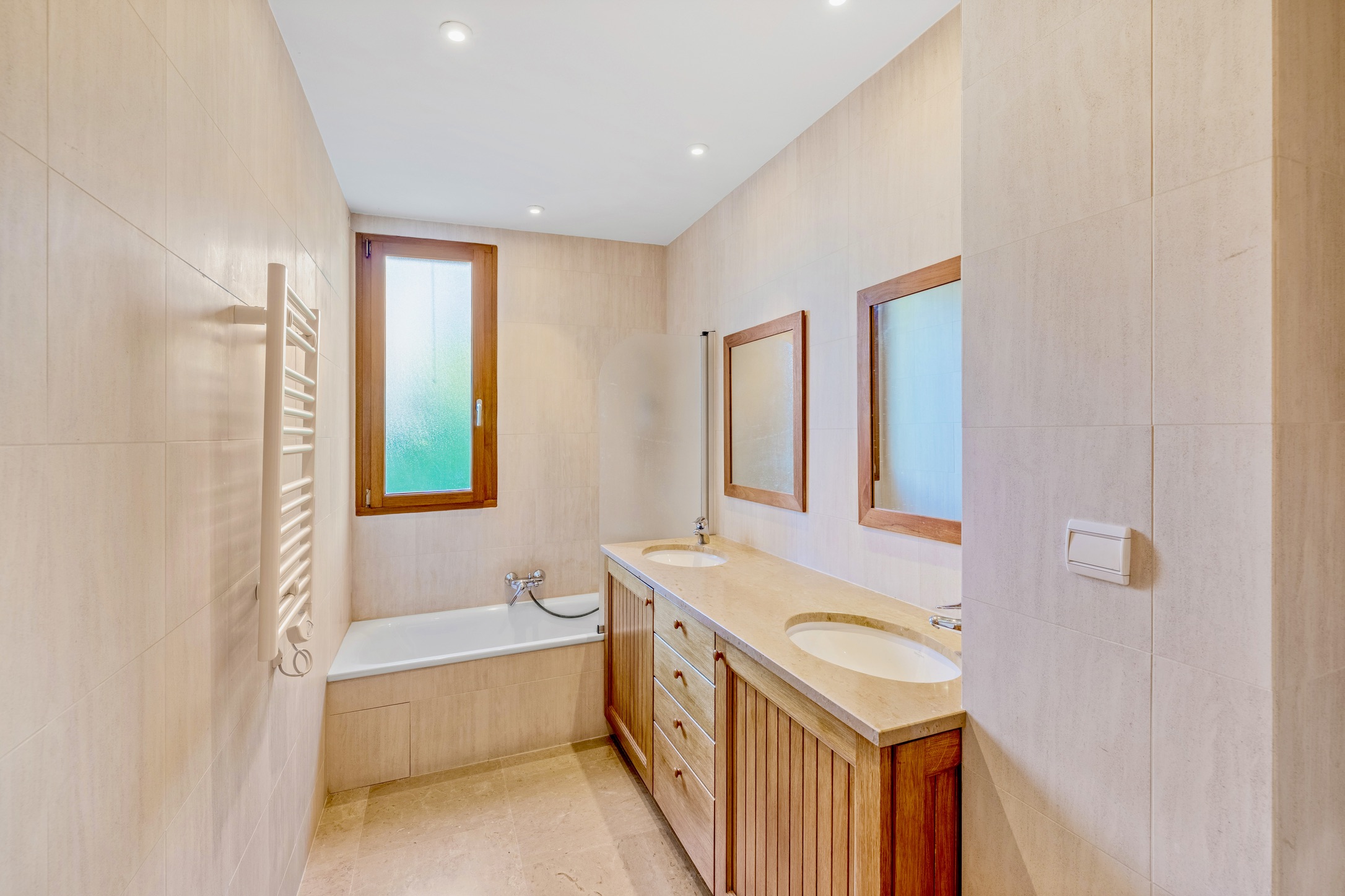 • Underfloor ecological electric heating and double-glazed exotic wood window frames ensure comfort and sustainability