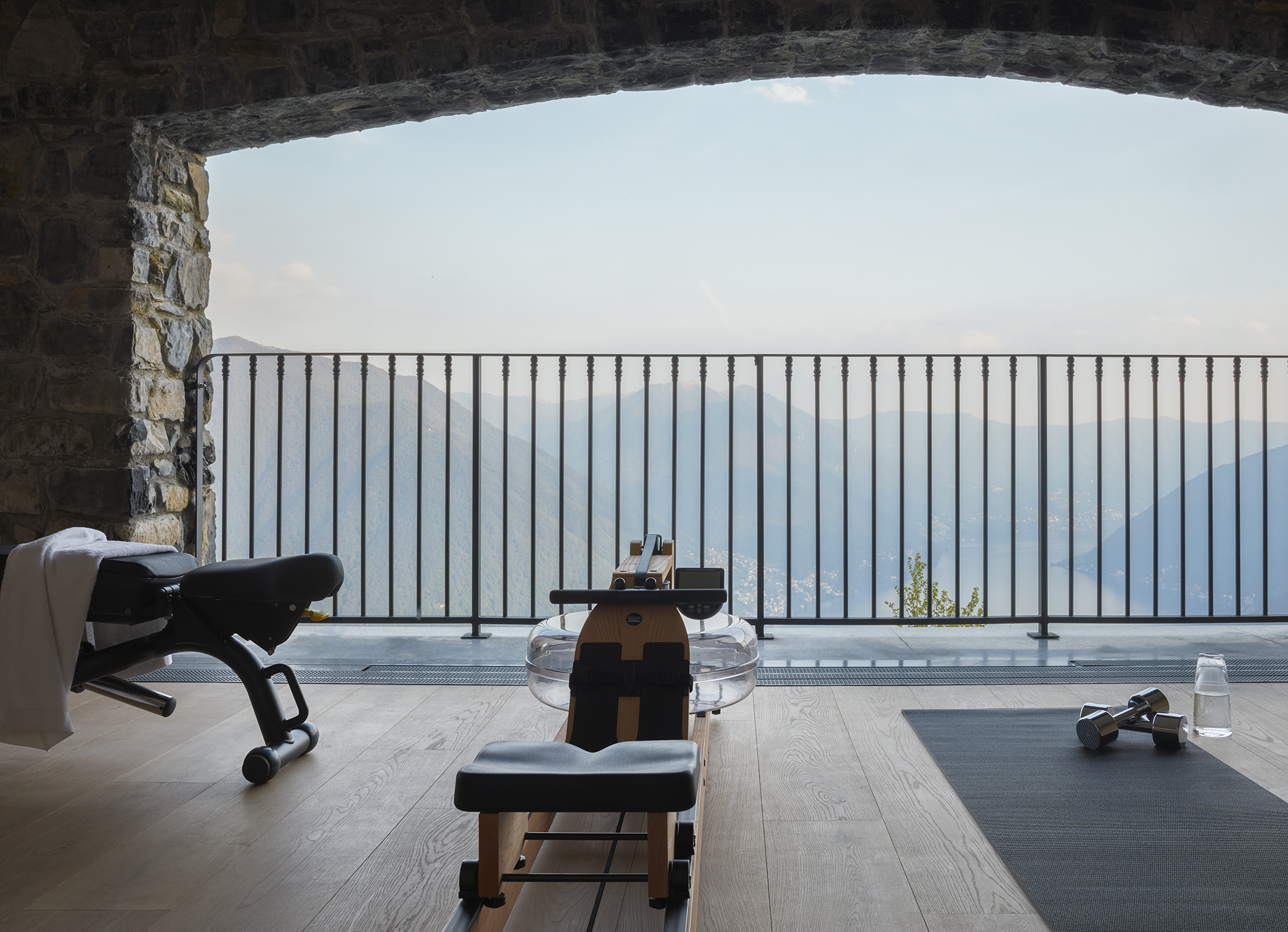 Also carved out of the rock-face is a quite stunning yoga/wellness facility. This large room with inspiring views down the lake can easily accommodate 8 yoga practitioners side by side and also includes an area for gym equipment from Technogym. This includes the Kinesis cable weight training system, a rowing machine, an exercise bike, dumbbells, stretch bands and exercise balls. This room also benefits from an ensuite toilet, steam room and shower.