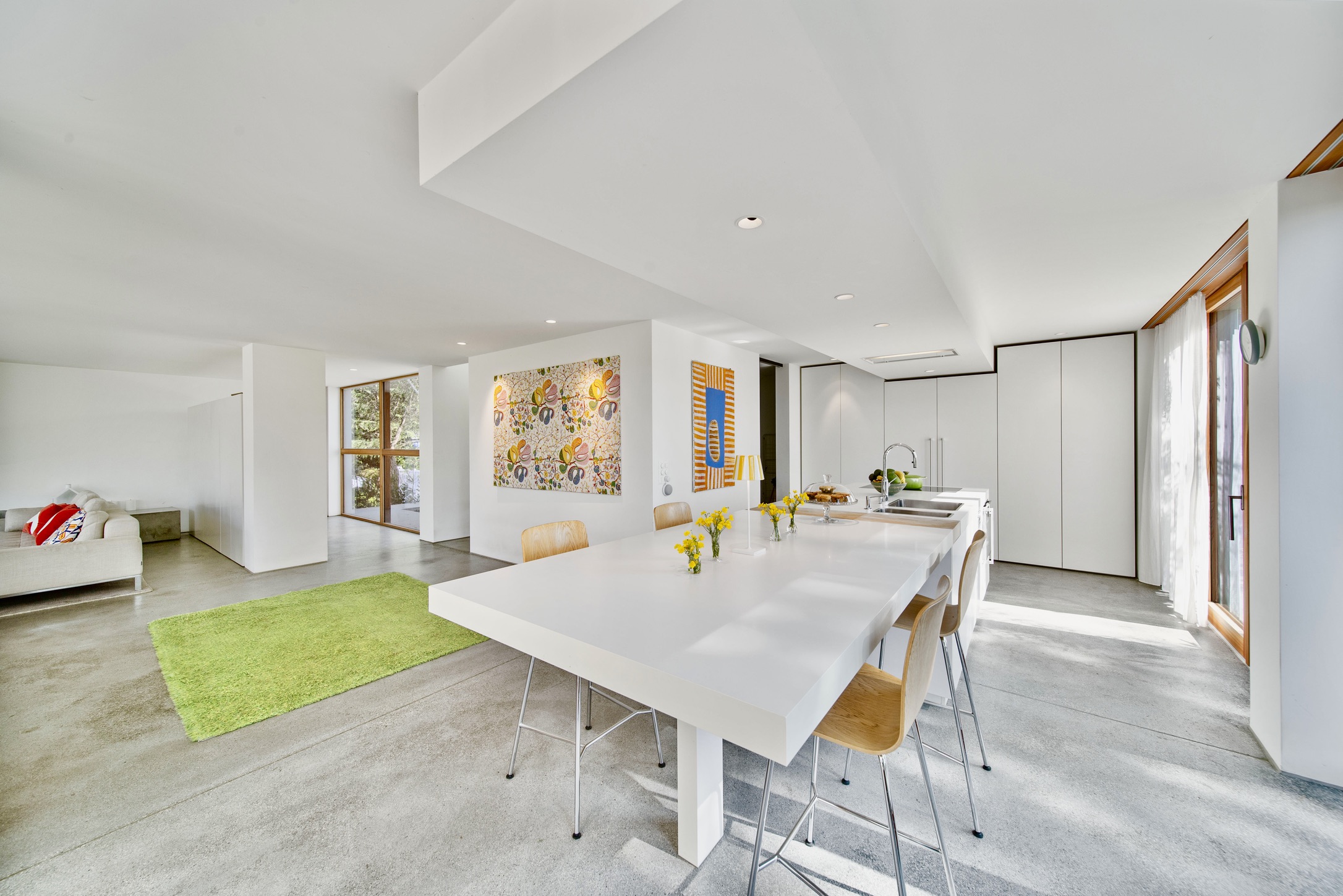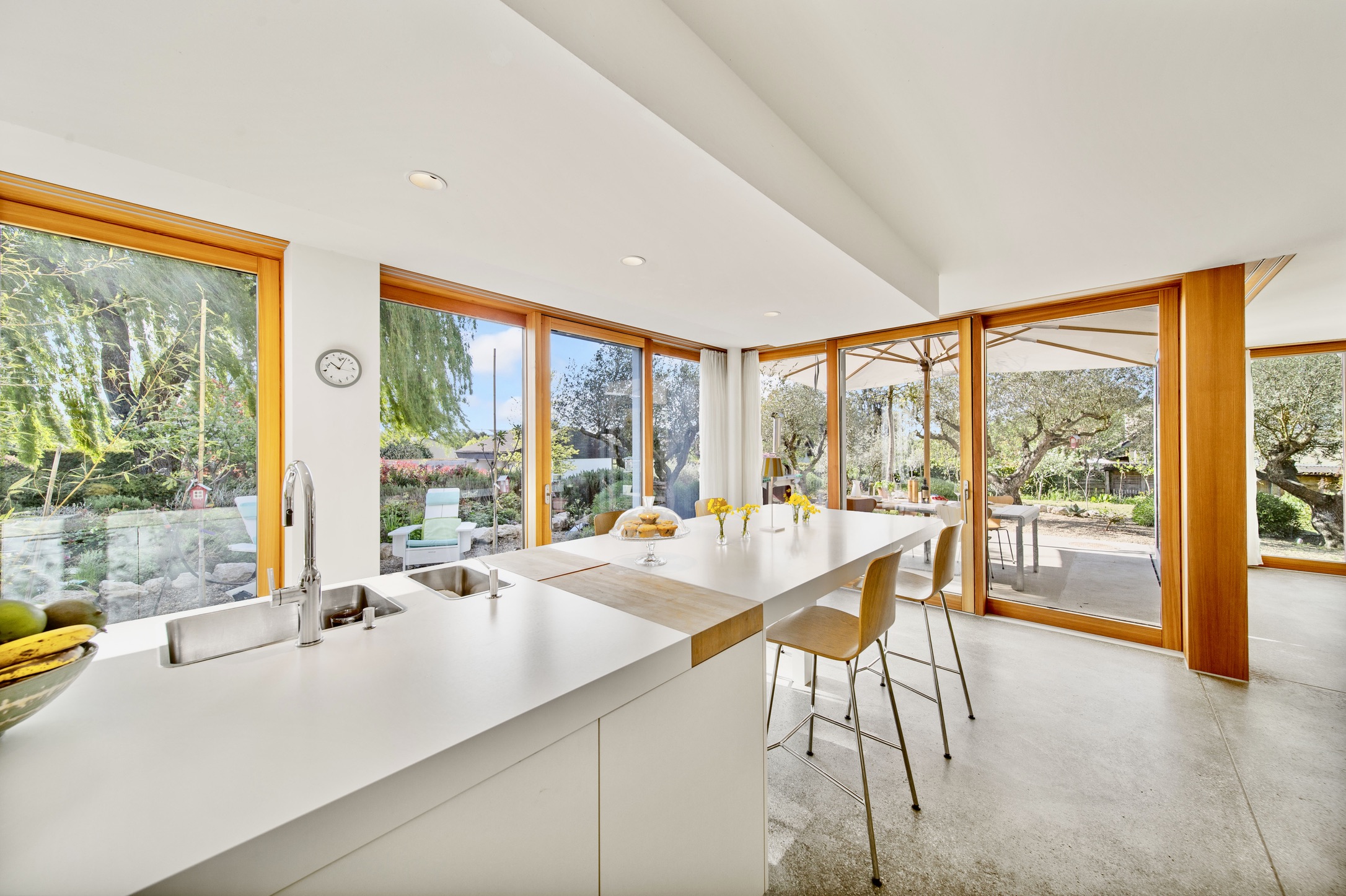 The interior of the house is tastefully decorated with elegant minimalistic finishes, including concrete floors, custom cabinetry, and high-end appliances. The main living area is bright and airy, with large windows that flood the space with natural light and offer stunning views of the surrounding landscape and nature. The property’s ground floor features a fully equipped kitchen, a dining area and a spacious living room, and access to outdoor terraces.